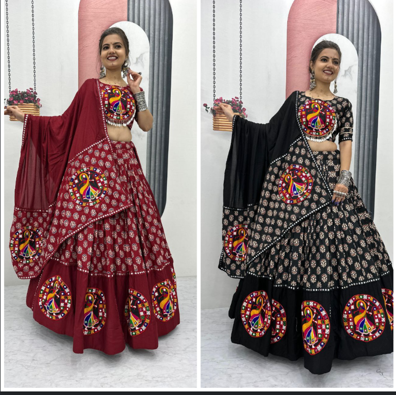 Navratri กาธิพิเศษทำงานร่วมกับกระจกลูกไม้ผ้าฝ้ายแท้ lehenga choli สำหรับงานแต่งงานแฟชั่นชาติพันธุ์และฟังก์ชั่นงานรื่นเริง