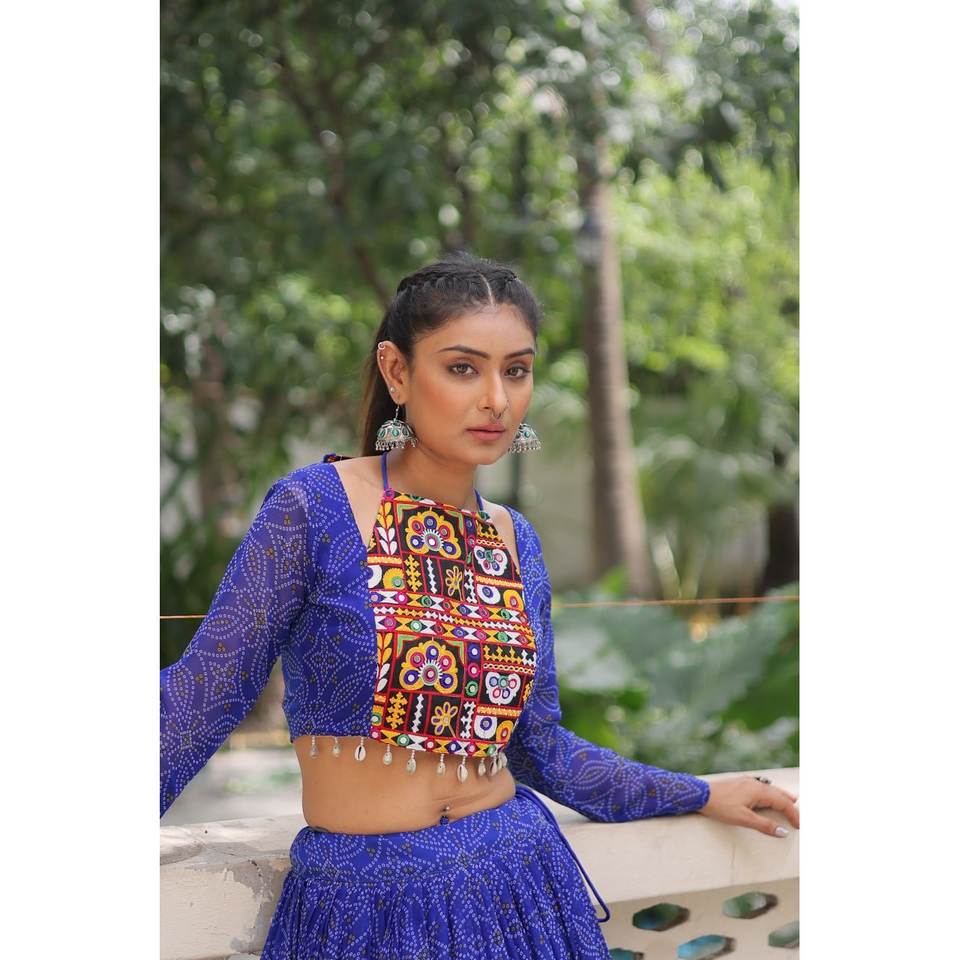 ชุดเลเฮนกาโชลีสำหรับผู้หญิง งานพิเศษสำหรับเทศกาลนาวราตรี พร้อมงานปักลูกปัดแบบกอต้าปาตติ