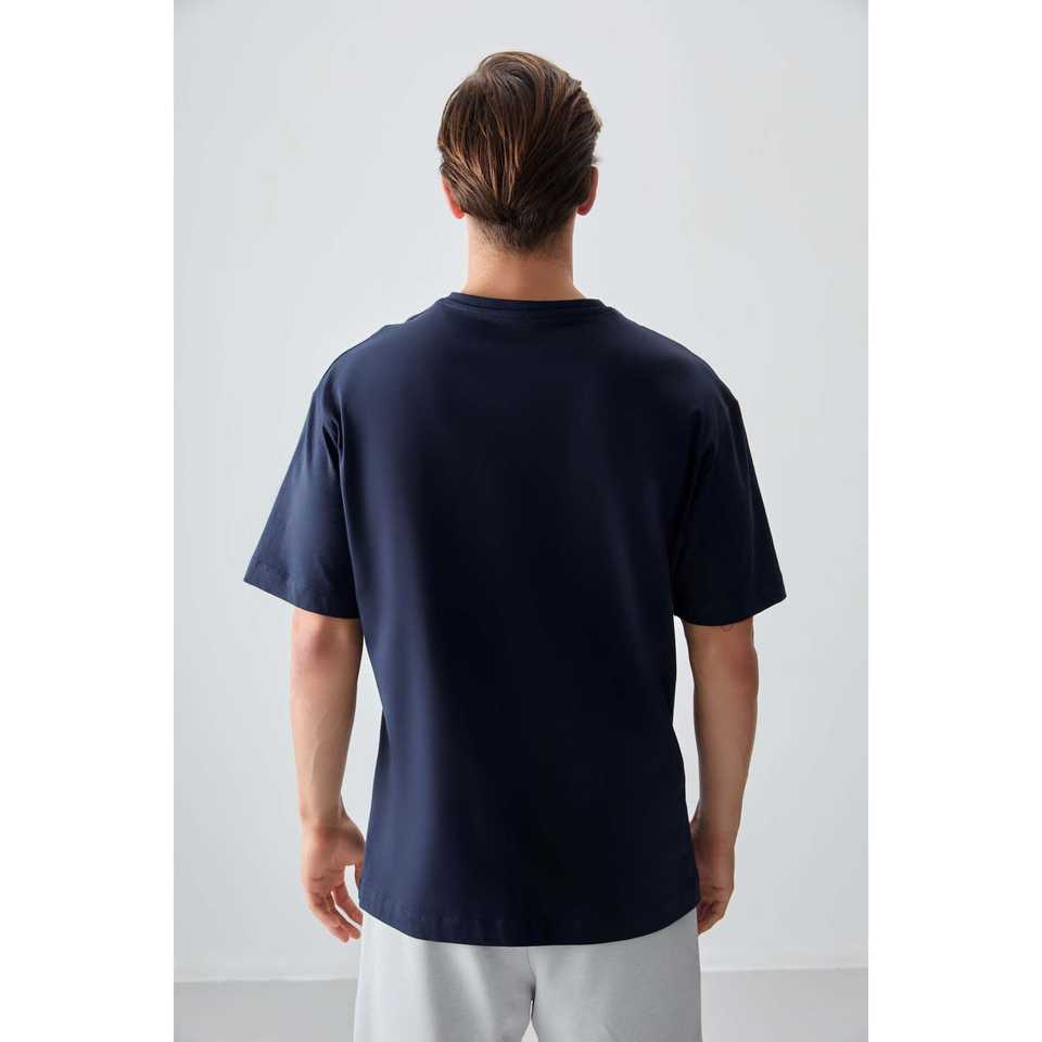 เสื้อยืดผู้ชายสีน้ำเงินกรมท่า ผ้าฝ้ายถัก 100% เนื้อหนานุ่ม ทรงโอเวอร์ไซส์ พิมพ์ลาย-88355