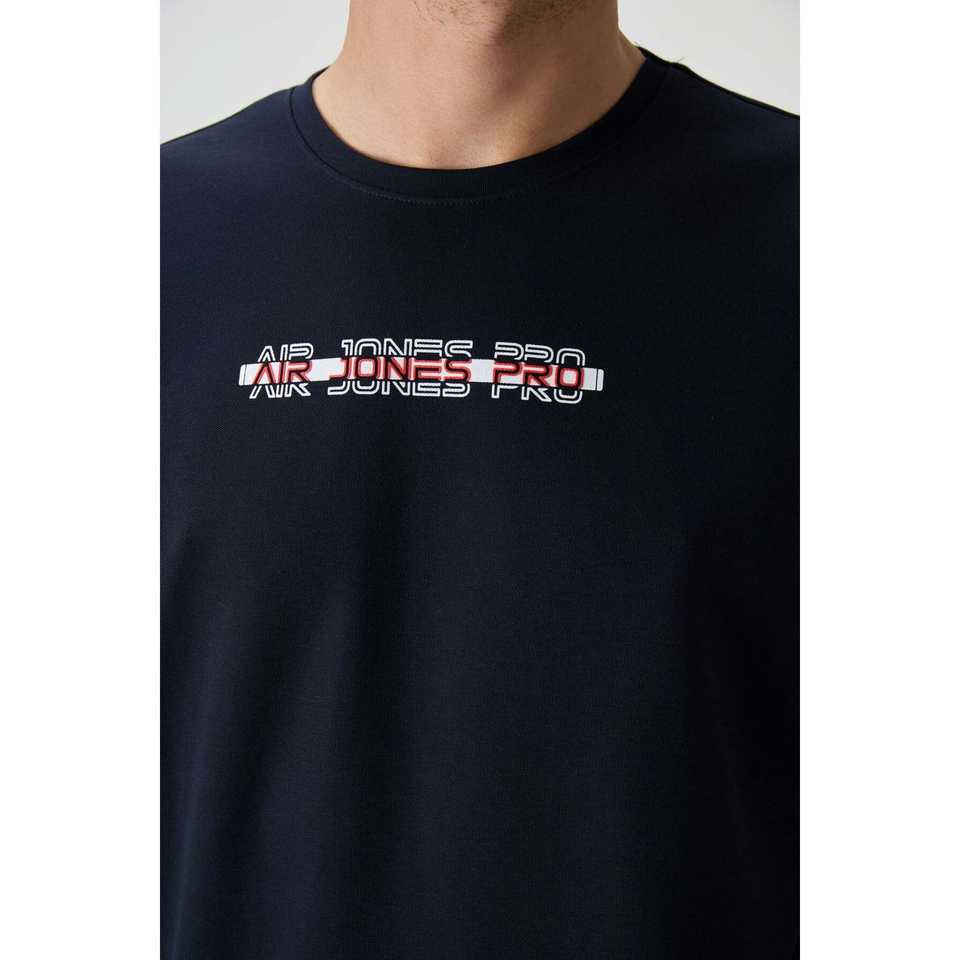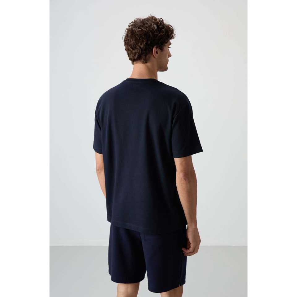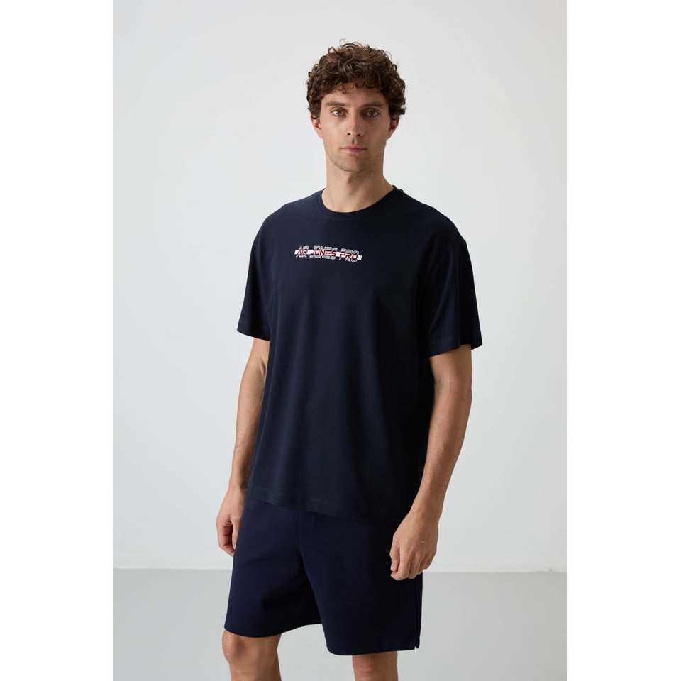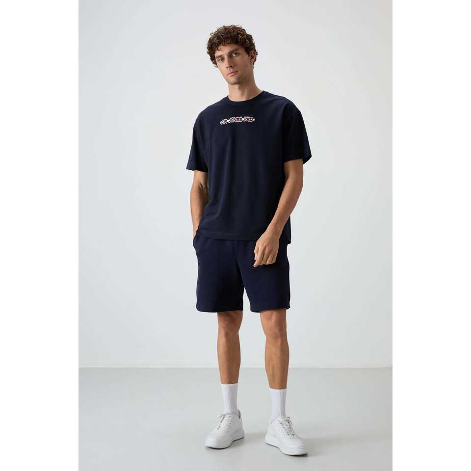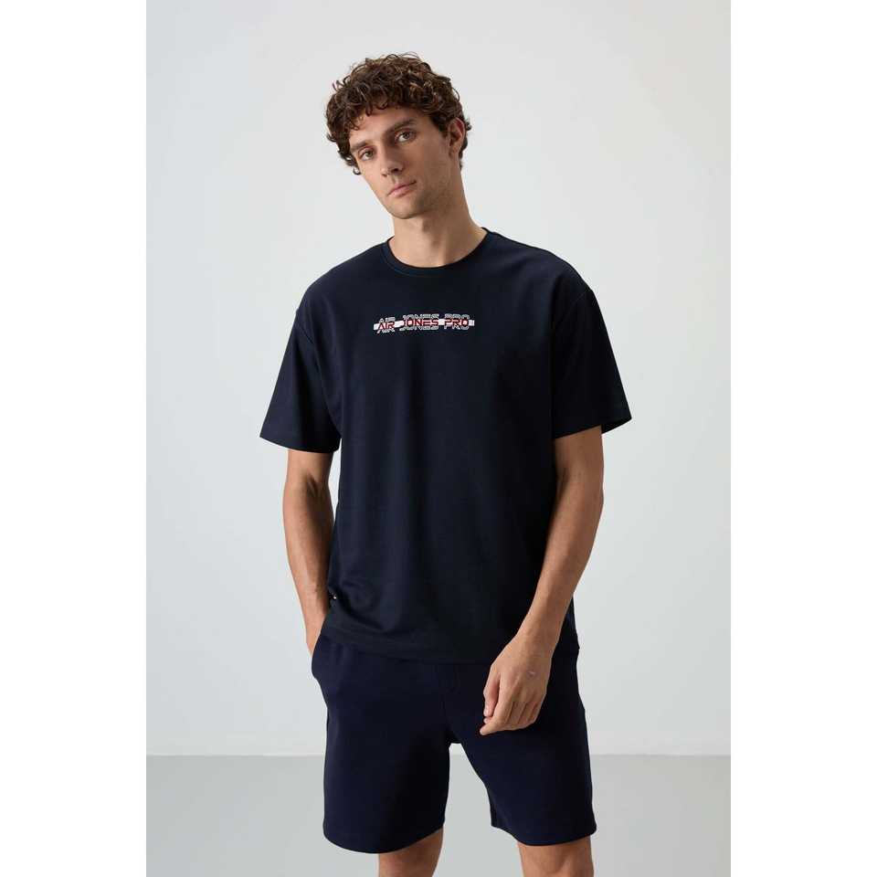 เสื้อยืดสีน้ำเงินกรมท่า ผ้าฝ้าย 100% สำหรับผู้ชาย เนื้อผ้าหนา ทรงโอเวอร์ไซส์ พร้อมลายพิมพ์บนผ้าเจอร์ซีย์-88365