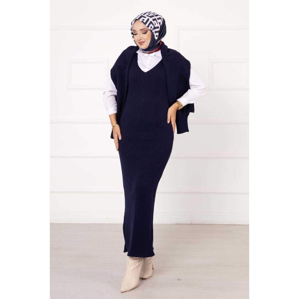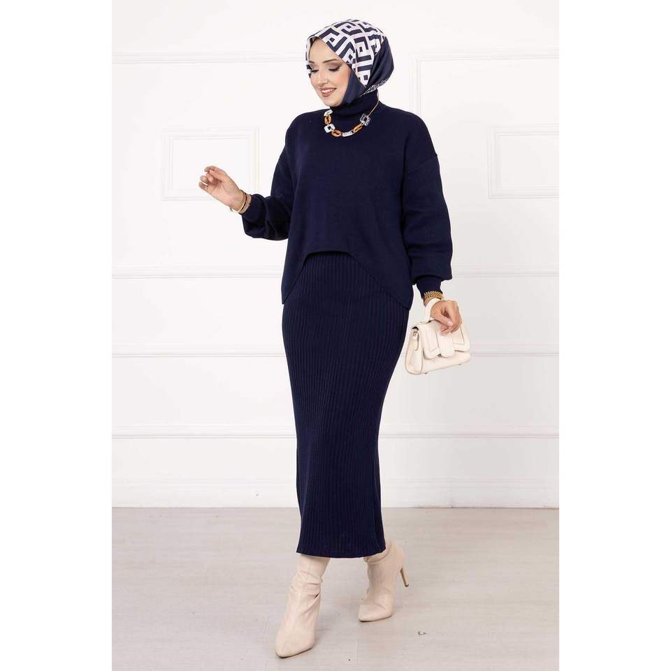 ชุดสั้นของผู้หญิง2ชิ้นสีน้ำเงินเข้มยาวเหนือเข่าทรงหลวมขนาด XL