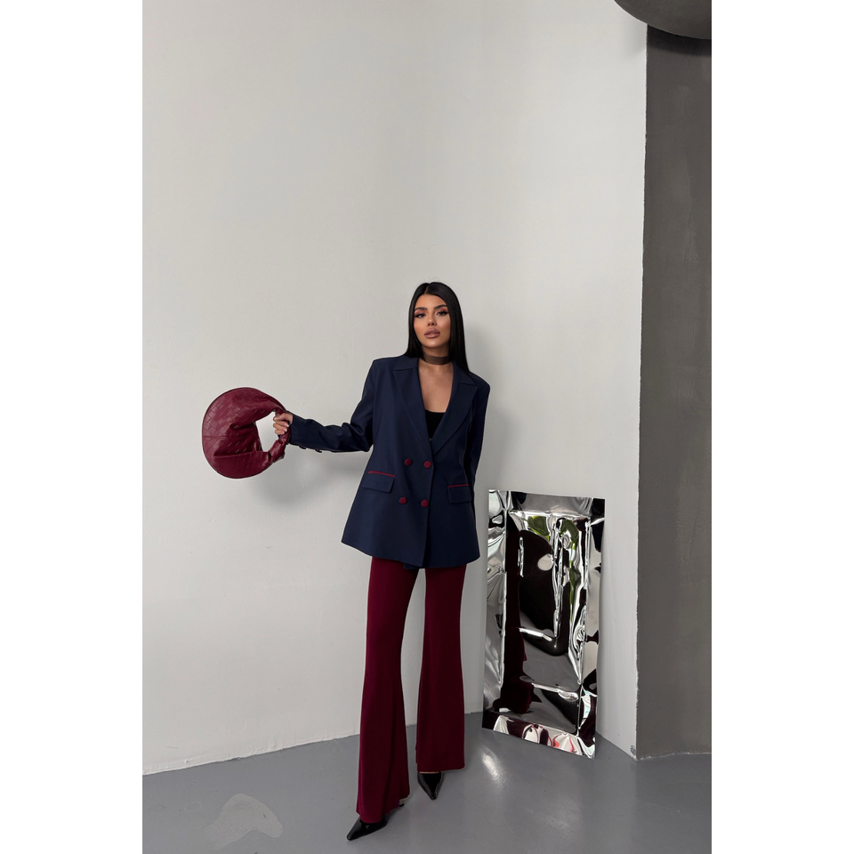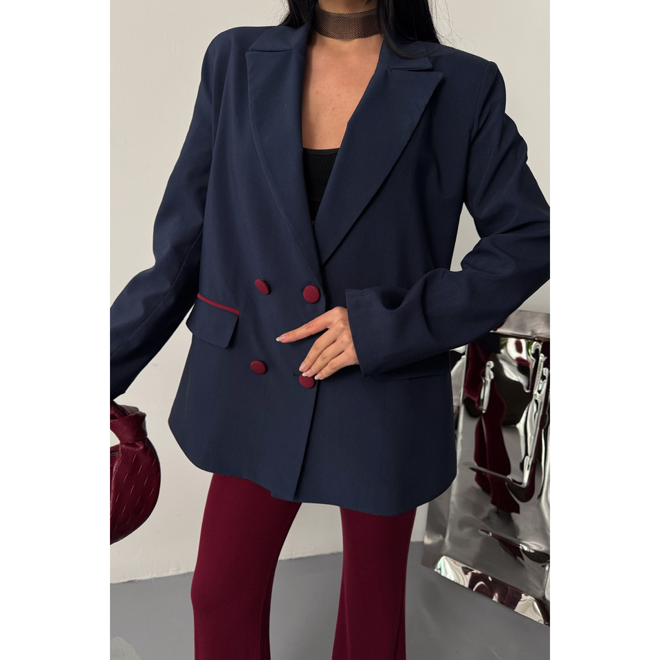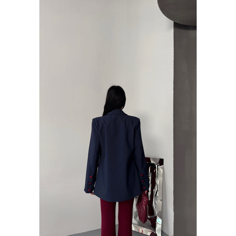 เสื้อแจ็คเก็ตผู้หญิงสีน้ำเงินกรมท่าแบบมีกระดุมและผ้าคลุม