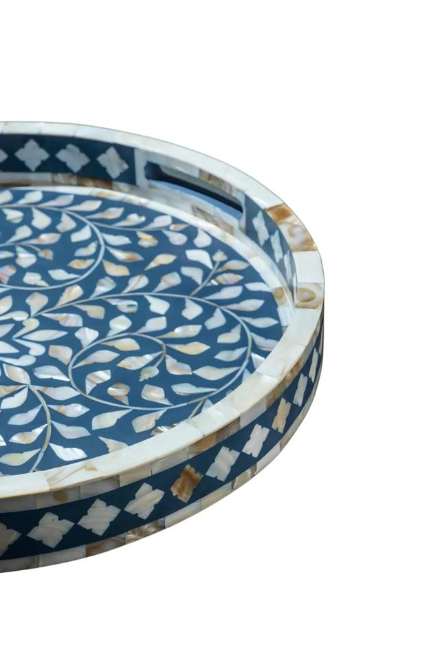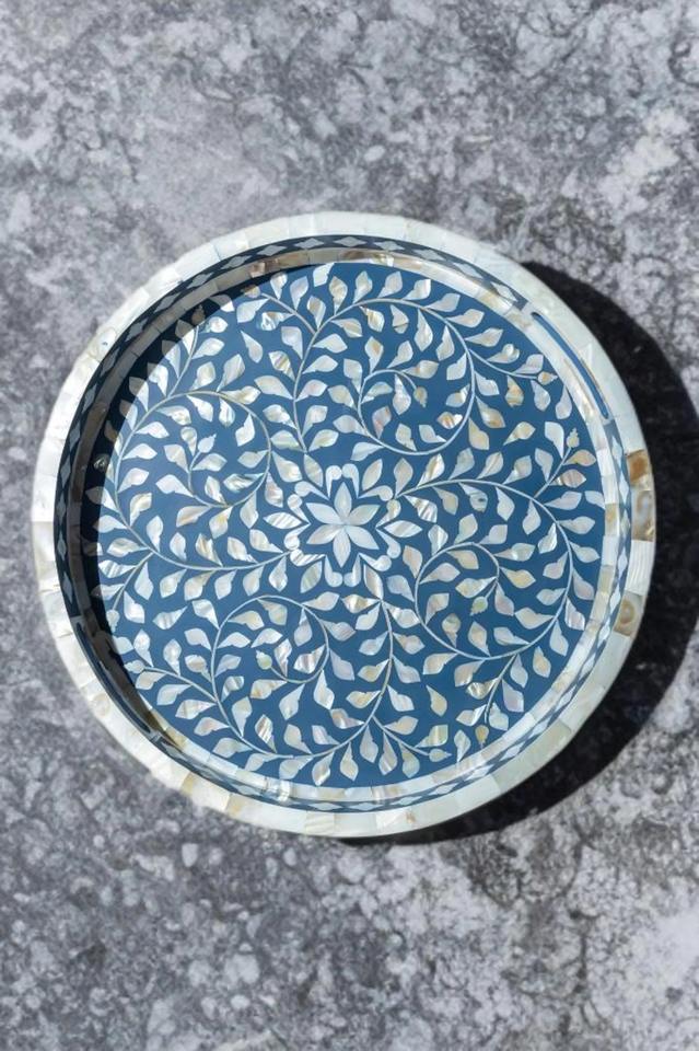 ถาดกลมพิมพ์ลายดอกไม้สีน้ำเงินเข้มพร้อมฝังมุกถาดเสิร์ฟหรูหราสำหรับงานแต่งงานโต๊ะอาหารห้องนั่งเล่นเครื่องดื่ม