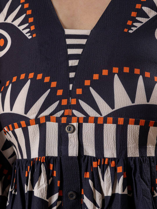 เดรสสีน้ำเงินกรมท่า ผ้าจอร์เจตต์ พิมพ์ลายดอกไม้ ทรงหลวม คอวี แขนสั้น ระบายอากาศได้ดี จับจีบระบาย ความยาวระดับเข่า เอวทรงธรรมชาติ