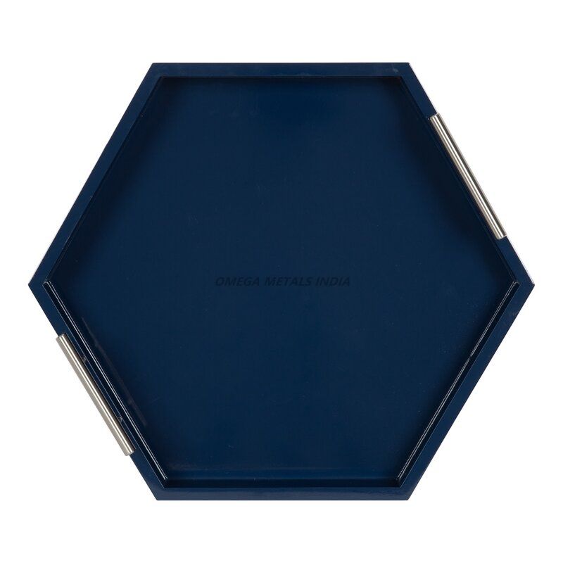 ถาดเสิร์ฟทรงหกเหลี่ยมสีน้ำเงินกรมท่าพร้อมด้ามจับที่เพรียวบางและดีไซน์ร่วมสมัยเหมาะสำหรับการเสิร์ฟเครื่องดื่มและของว่างอย่างมีสไตล์
