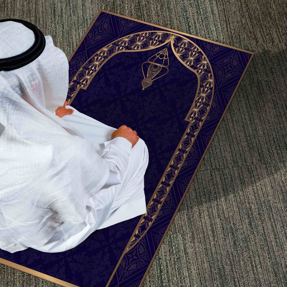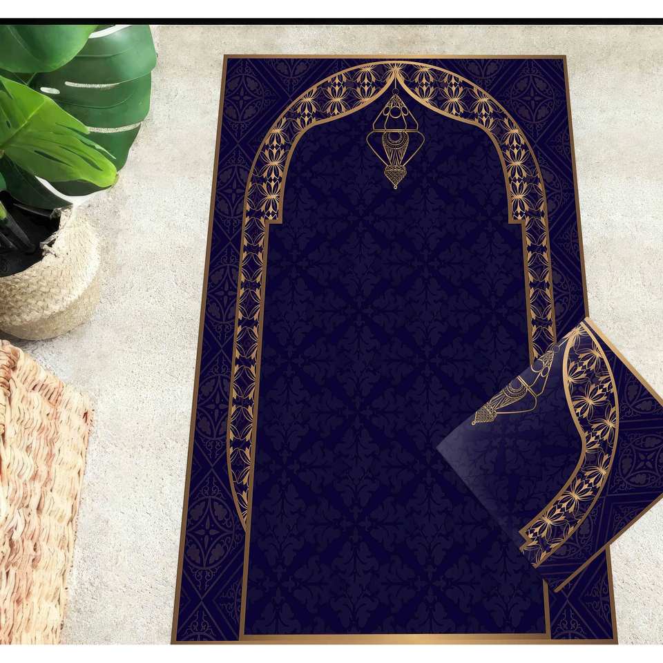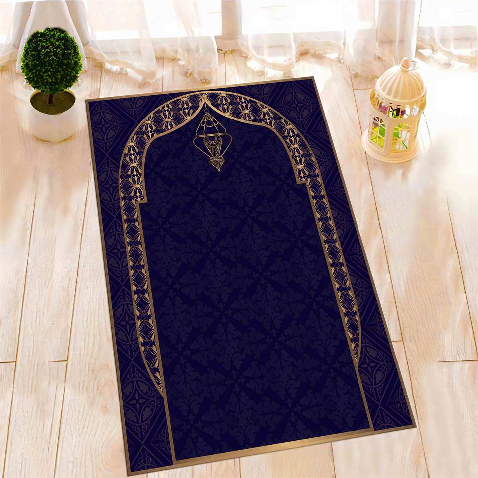 พรมละหมาดสีน้ำเงินกรมท่า: พรมพิมพ์ลายดีไซน์หรูหราสำหรับการสวดมนต์ พรมบางแบบไม่ถักทอ