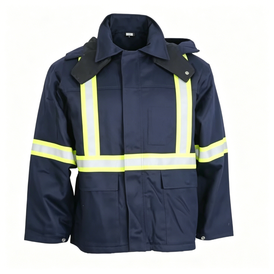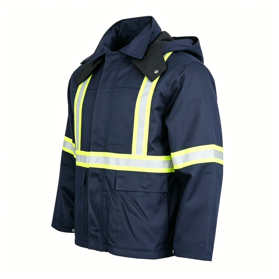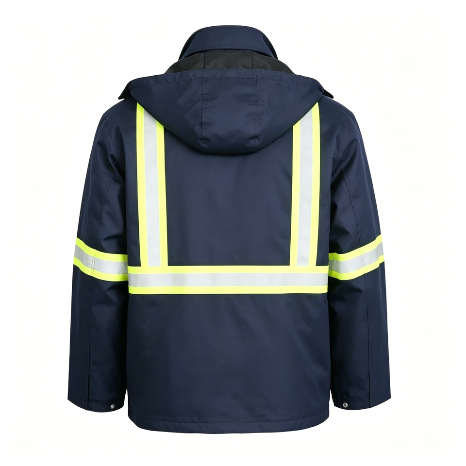 เสื้อแจ็คเก็ตนิรภัยสะท้อนแสงสีน้ำเงินกรมท่าสำหรับผู้ชาย ANSI Class 3 | เสื้อโค้ทกันน้ำบุผ้านวมสำหรับทำงานในฤดูหนาว มีกระเป๋าหลายช่อง แบบสั่งทำ