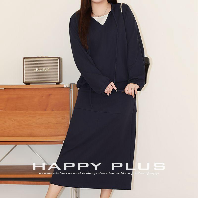 ชุดเสื้อสเวตเชิ้ตและกระโปรงมิดิสีกรมท่าสำหรับผู้หญิงไซส์พลัส สีพื้น แขนยาว ทรงเอไลน์ พร้อมป้ายและแท็ก