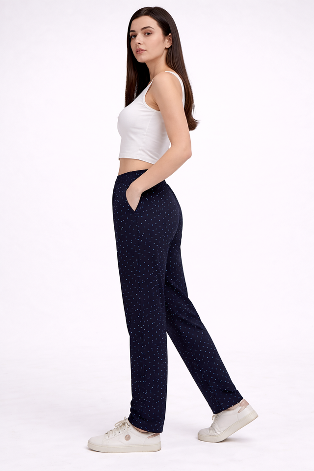 กางเกงวอร์มลายจุดสีน้ำเงินกรมท่าสำหรับผู้หญิง ผลิตจากผ้าเนื้อนุ่ม ระบายอากาศได้ดี น้ำหนักเบา ให้ความสบายเหนือระดับ