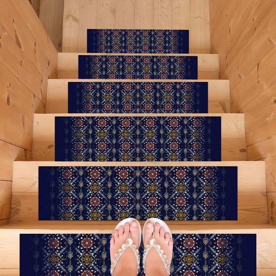 พรมพิมพ์ลายสีน้ำเงินกรมท่า - ลายโบโฮคิลิมสำหรับปูบันได พรมปูขั้นบันได