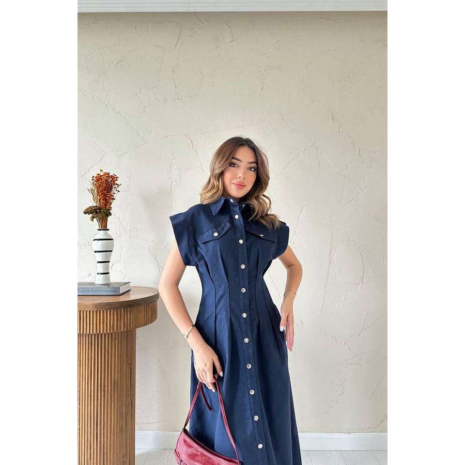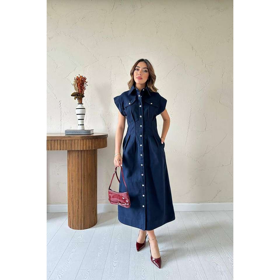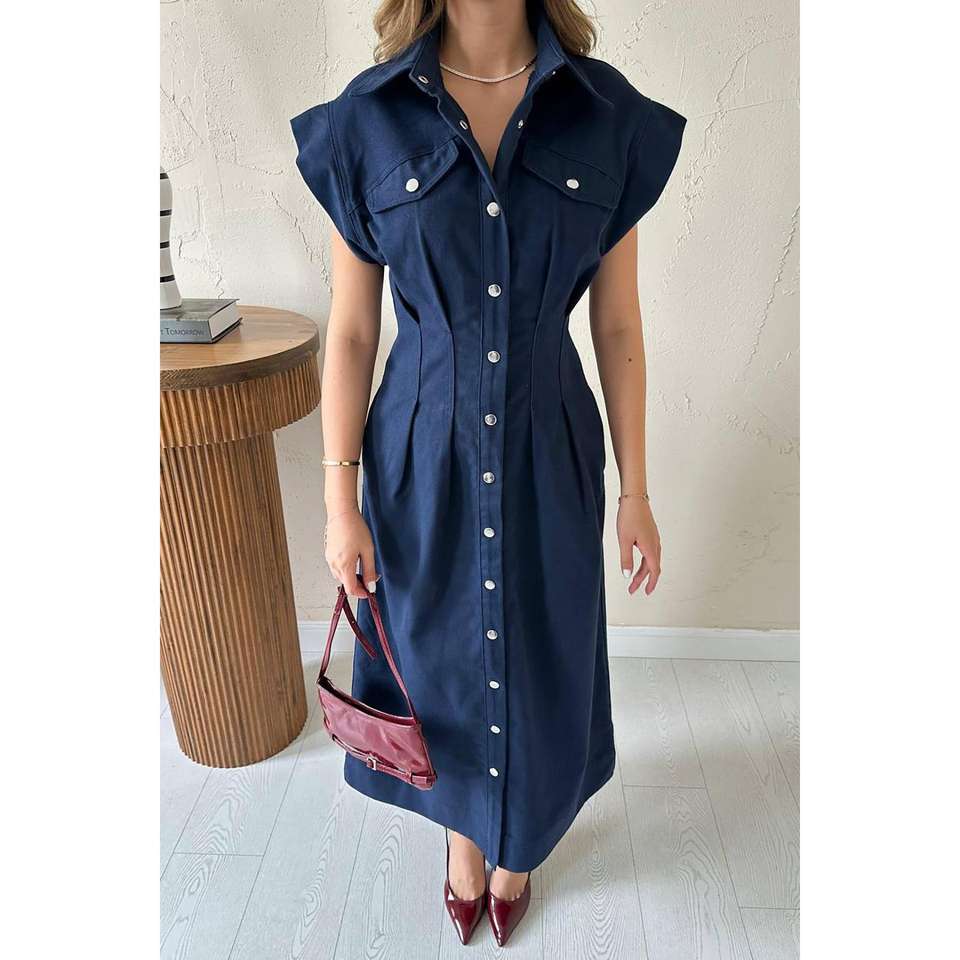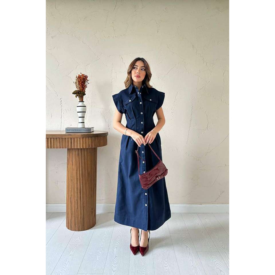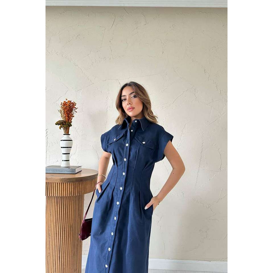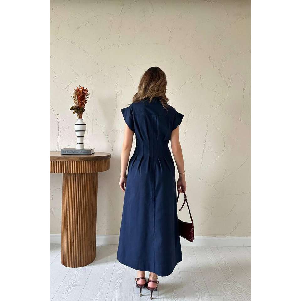 ชุดเดรสผ้ากาบาร์ดีนสีน้ำเงินกรมท่า ปกคอปกแบบพับได้ ทรงตรง สวมใส่สบาย เหมาะสำหรับทำงาน เอวทรงธรรมชาติ ผ้าทอ