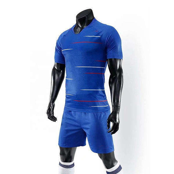 ชุดฟุตบอลครึ่งแขนคอวีสีน้ำเงินเข้มชุดฟุตบอลผ้าโพลีเอสเตอร์ออกแบบโลโก้ได้ตามต้องการ