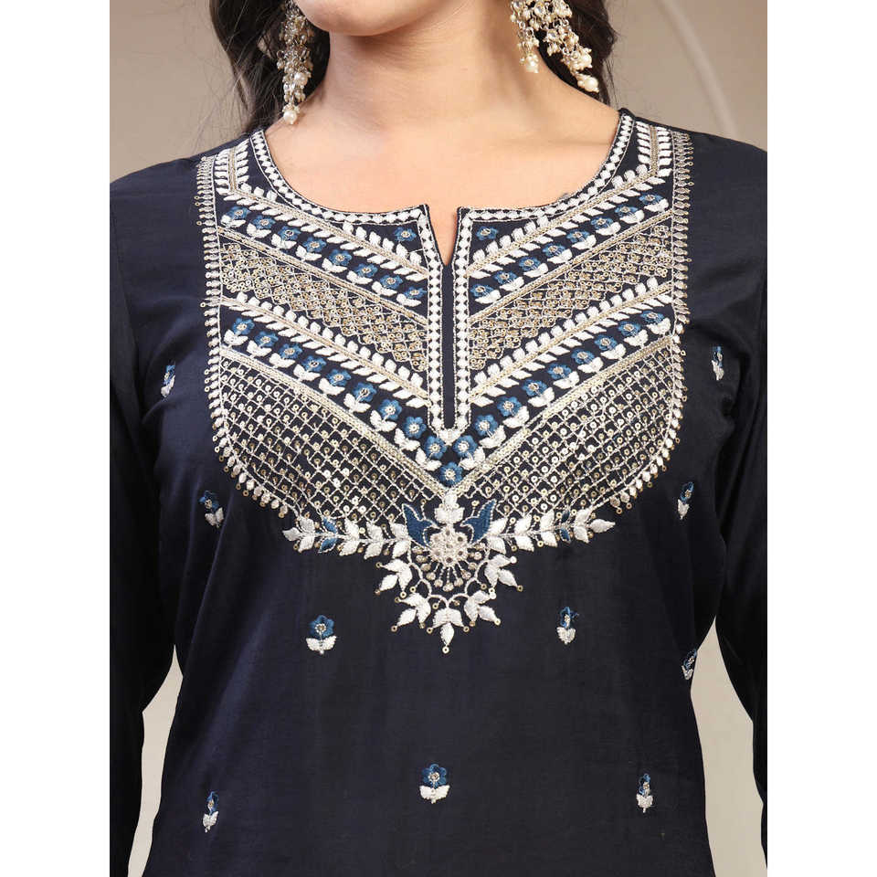 ชุดคุร์ตะผ้าไหมซาตินปักลายสีน้ำเงินกรมท่าสำหรับผู้หญิง คอกลม แขนสามส่วน พร้อมกางเกงขายาวและผ้าคลุมไหล่