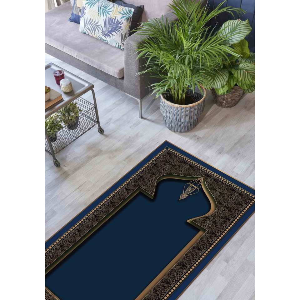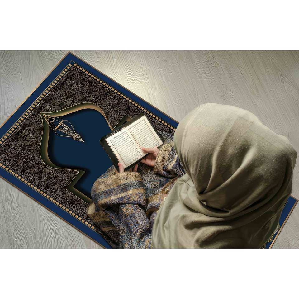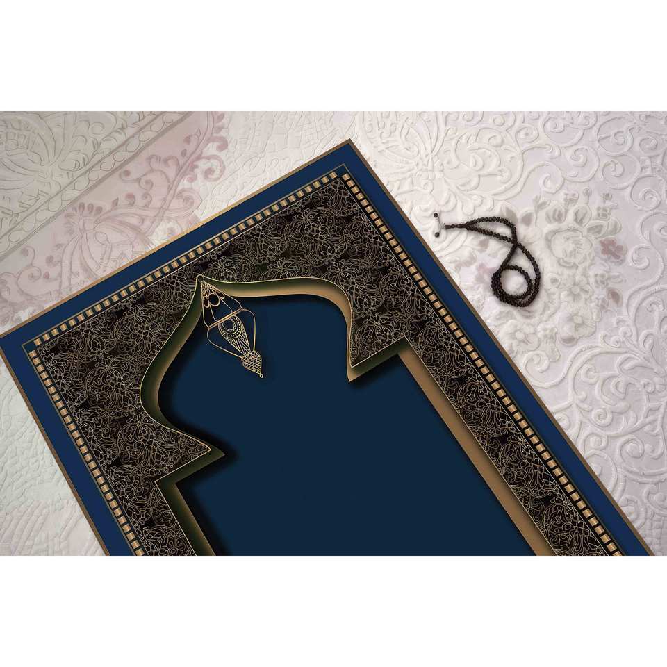 พรมสวดมนต์ขนแกะสีน้ำเงินเข้มดีไซน์ปะต่อสีทองเป็นมิตรกับสิ่งแวดล้อมสไตล์ดั้งเดิมแผ่นรองยางหนาปานกลางของขวัญทางจิตวิญญาณ