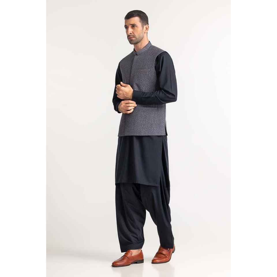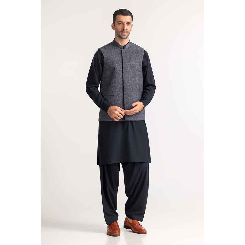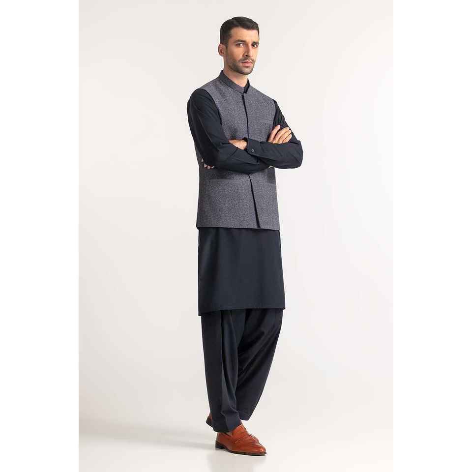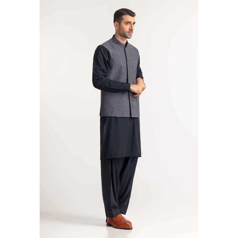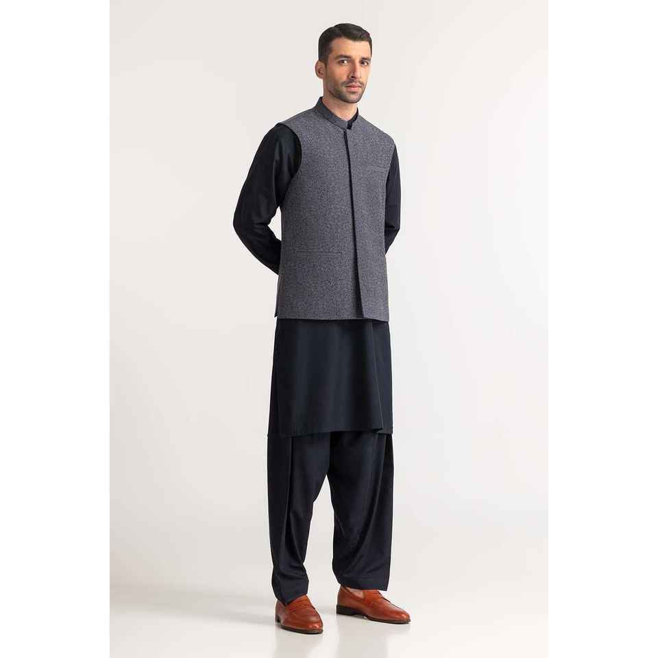 เสื้อกั๊กขนสัตว์สีน้ำเงินกรมท่า รุ่น WC-PD24-012 สไตล์สมาร์ทแคชชวล ตกแต่งกระดุมลายเพสลีย์ เหมาะสำหรับสวมใส่เป็นเสื้อนอก