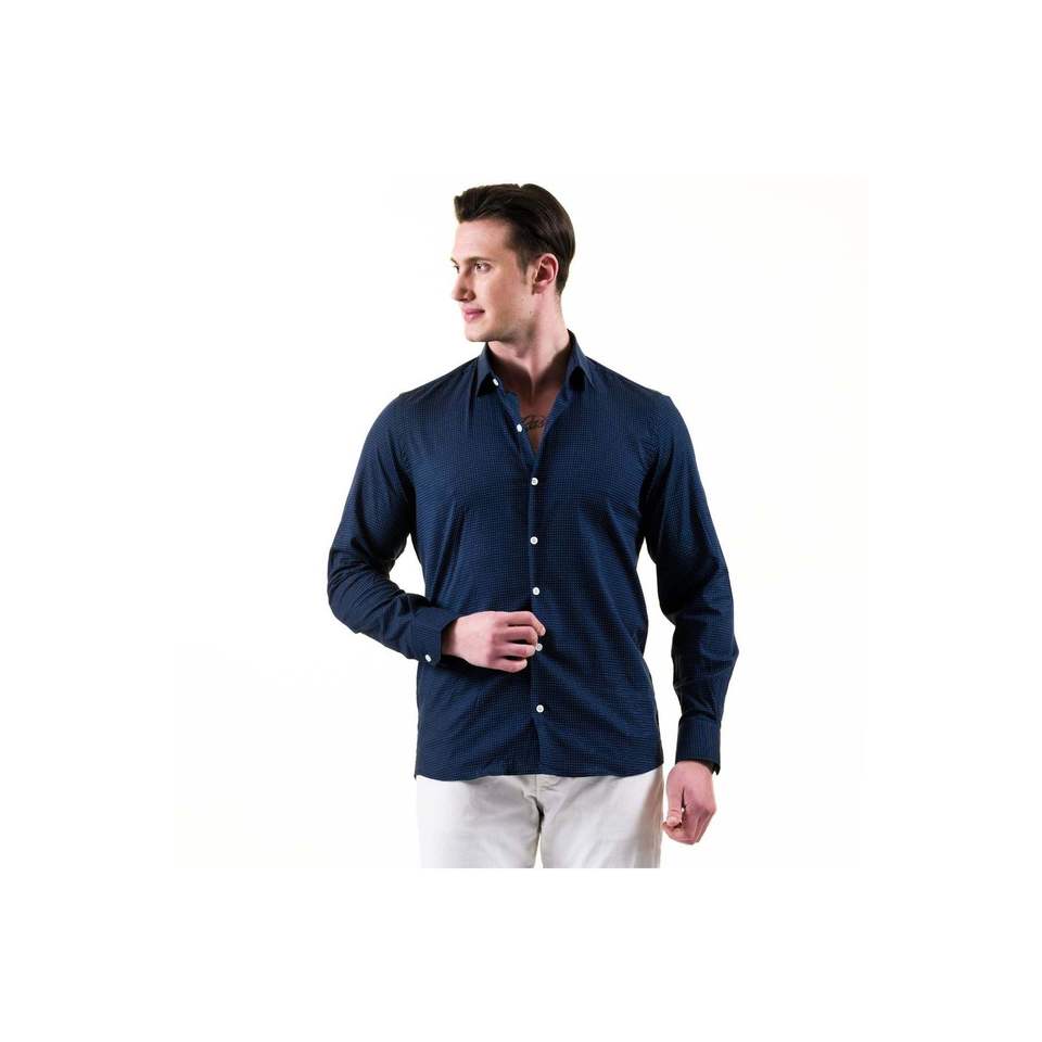 เสื้อเชิ้ตผ้าฝ้ายสีน้ำเงินเข้มสำหรับฤดูร้อนพิมพ์ลายจุดสีขาวระบายอากาศได้ทรงสลิมฟิต