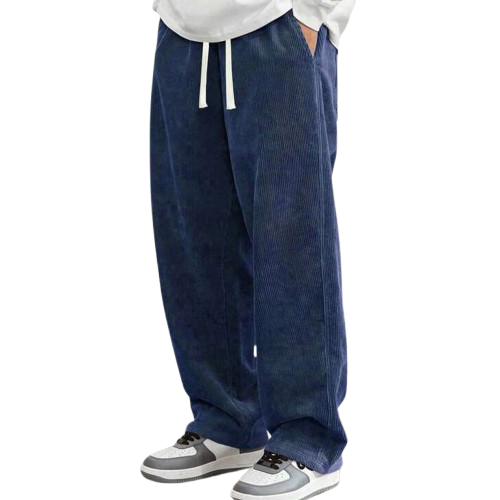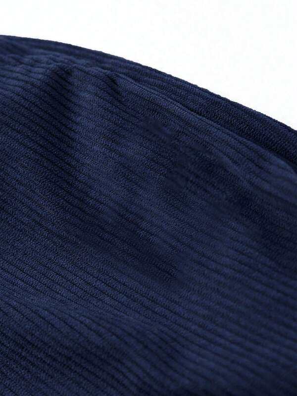 กางเกงขาบานผ้าลูกฟูกสีน้ำเงินเข้มของผู้ชายกางเกงซักด้วยยางยืดเอวยางยืดทรงหลวมเนื้อผ้านุ่ม