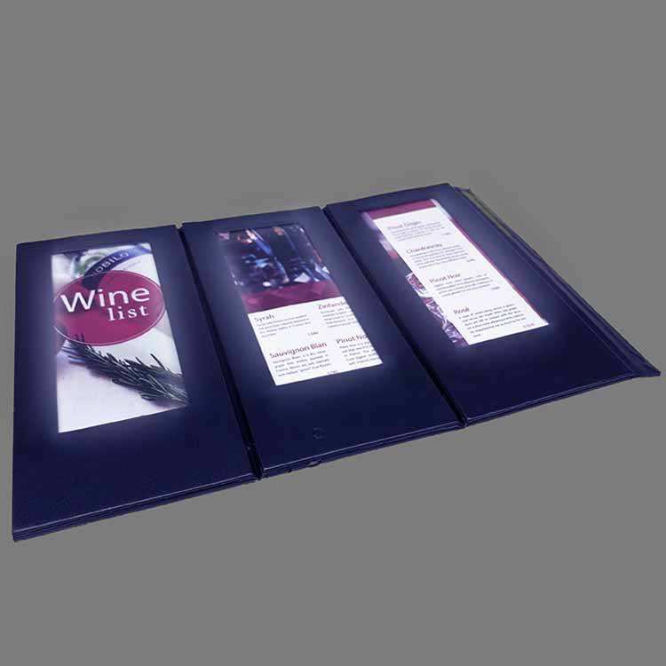 ขาตั้งโต๊ะแบบหมุนได้พร้อมไฟ LED 3 ด้าน ทำจากหนังเทียมสีกรมท่า สำหรับเมนูร้านอาหาร บาร์ และไนต์คลับ