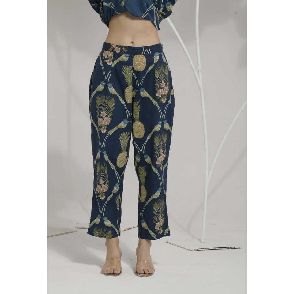 ชุดเสื้อและกางเกงแขนยาวถึงข้อเท้าสำหรับผู้หญิงลายนกรักแบบเป็นทางการสีกรมท่า
