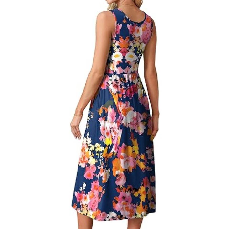 เดรสยาวลายดอกสีชมพูกรมท่า แขนกุด ผ่าข้าง สไตล์ลำลอง ผ้าถักยืด ใส่ได้ทุกวันสำหรับผู้หญิง รับทำป้ายแบรนด์