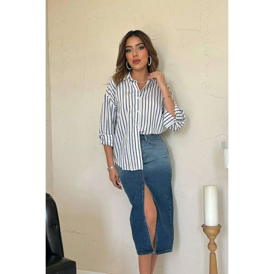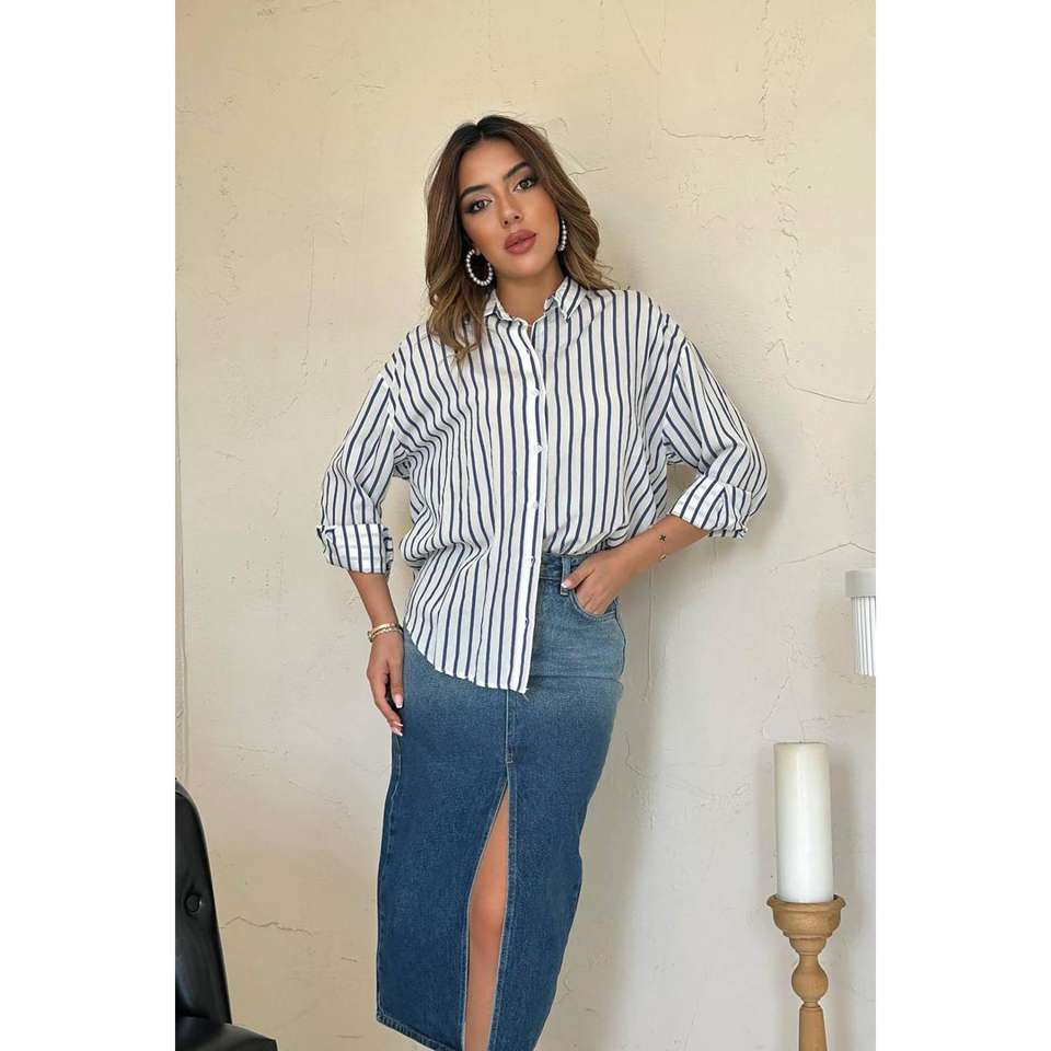 เสื้อเชิ้ตผู้หญิงลายทางสีกรมท่า ป๊อปลิน สไตล์ลำลองสำหรับทุกวัน แขนยาวผ่าหน้า