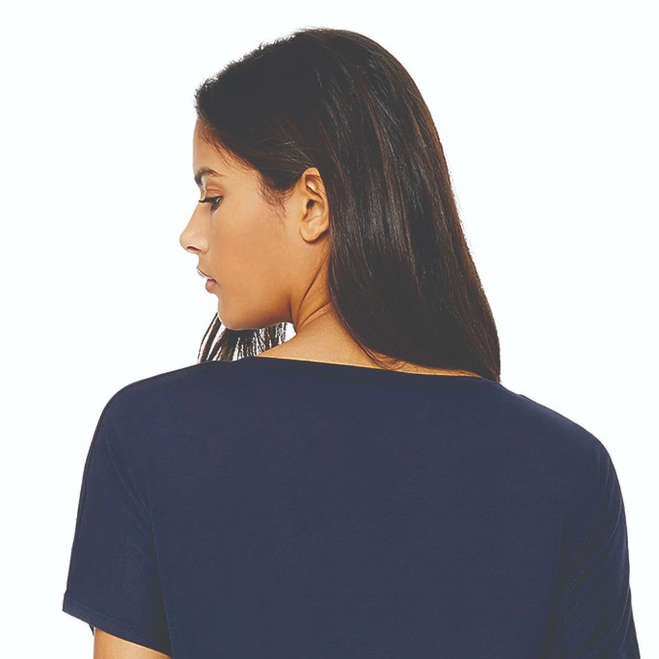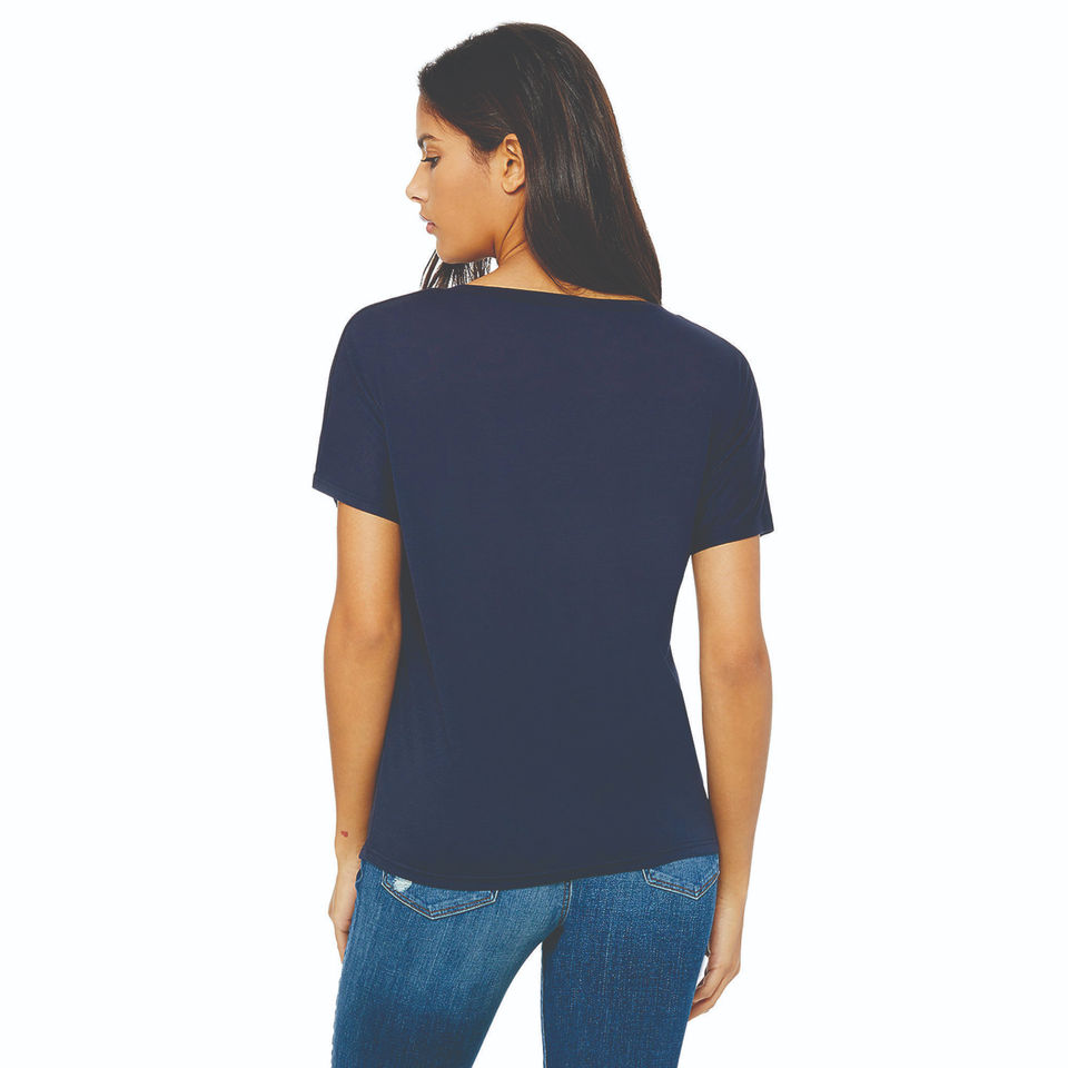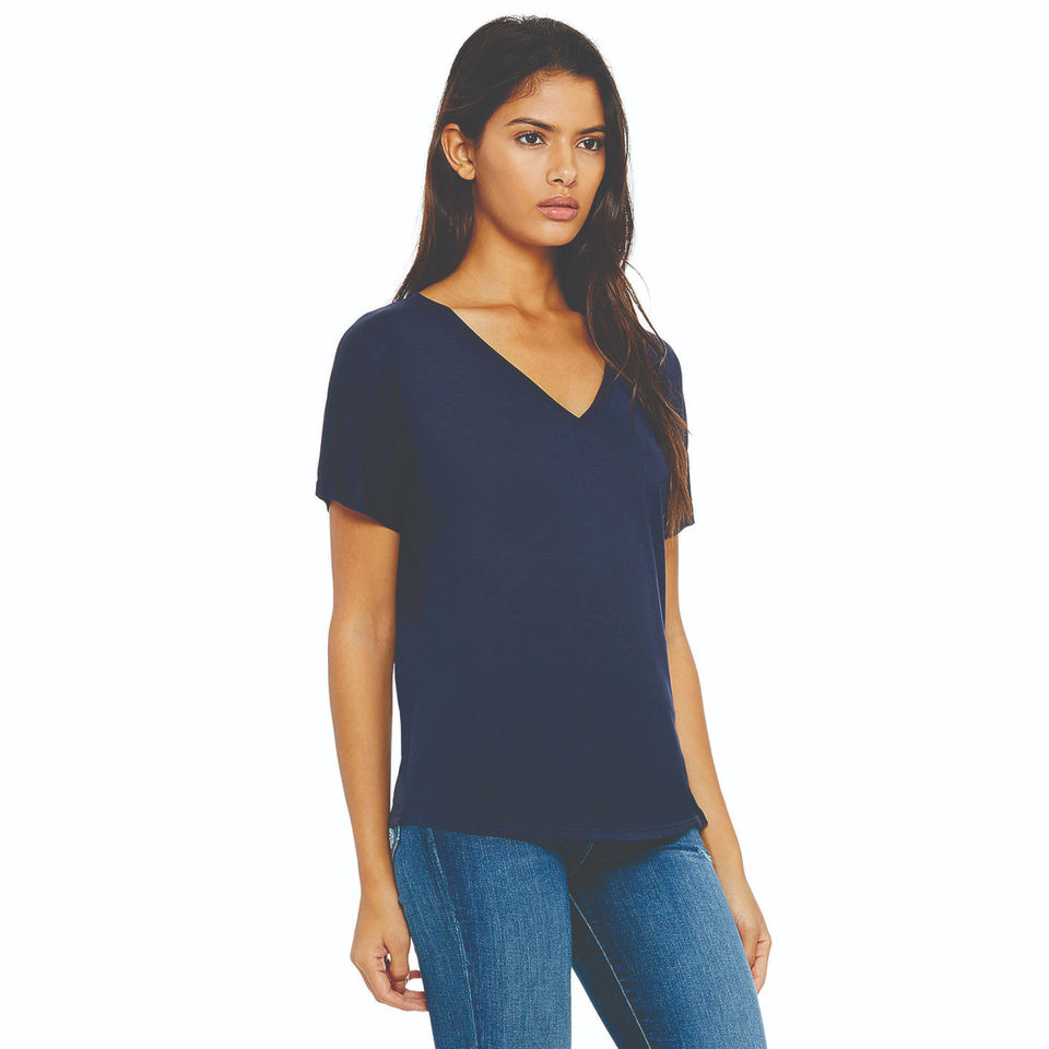 เสื้อยืดคอวีแบบลำลองสีกรมท่าสำหรับผู้หญิงเสื้อถักนิตติ้งผ้าโพลี35% เส้นใยโพลี65% 32 3.7ออนซ์ขอบโค้งมนละเอียดวิธีการทอ