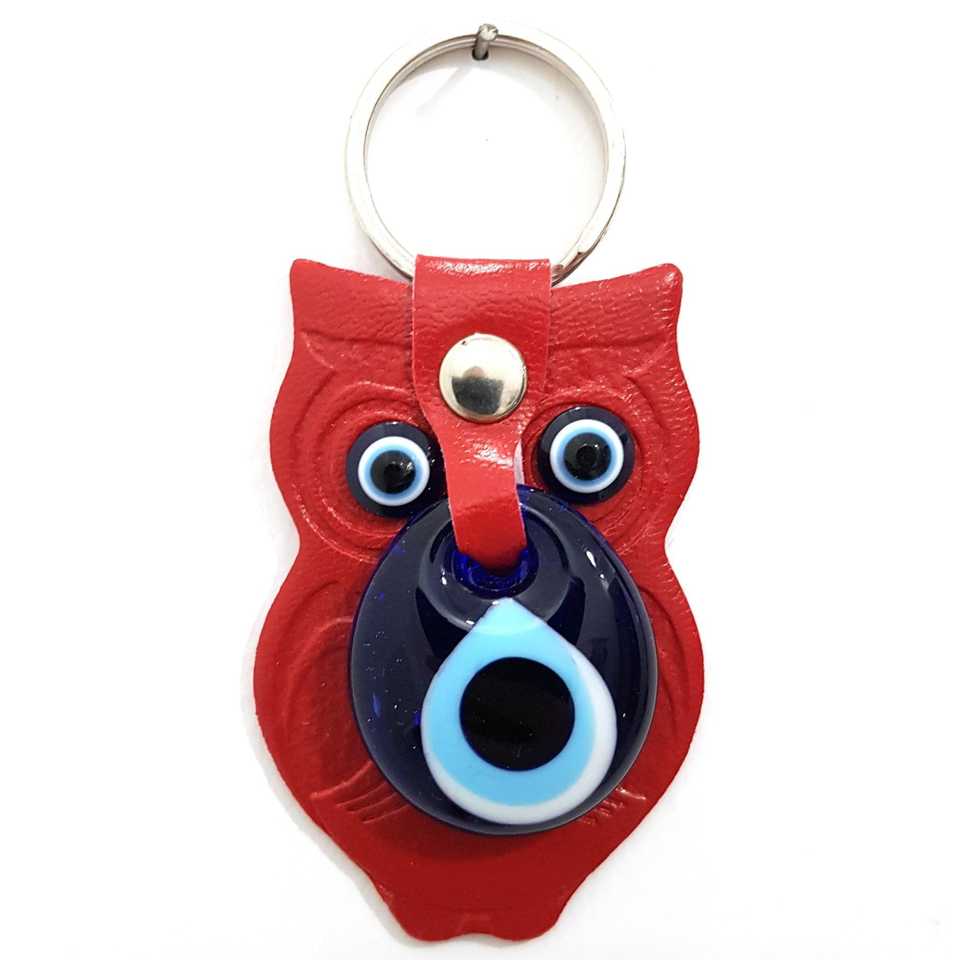 Nazar Boncuklu Deri Baykuş Kırmızı Anahtarlık Key Chains