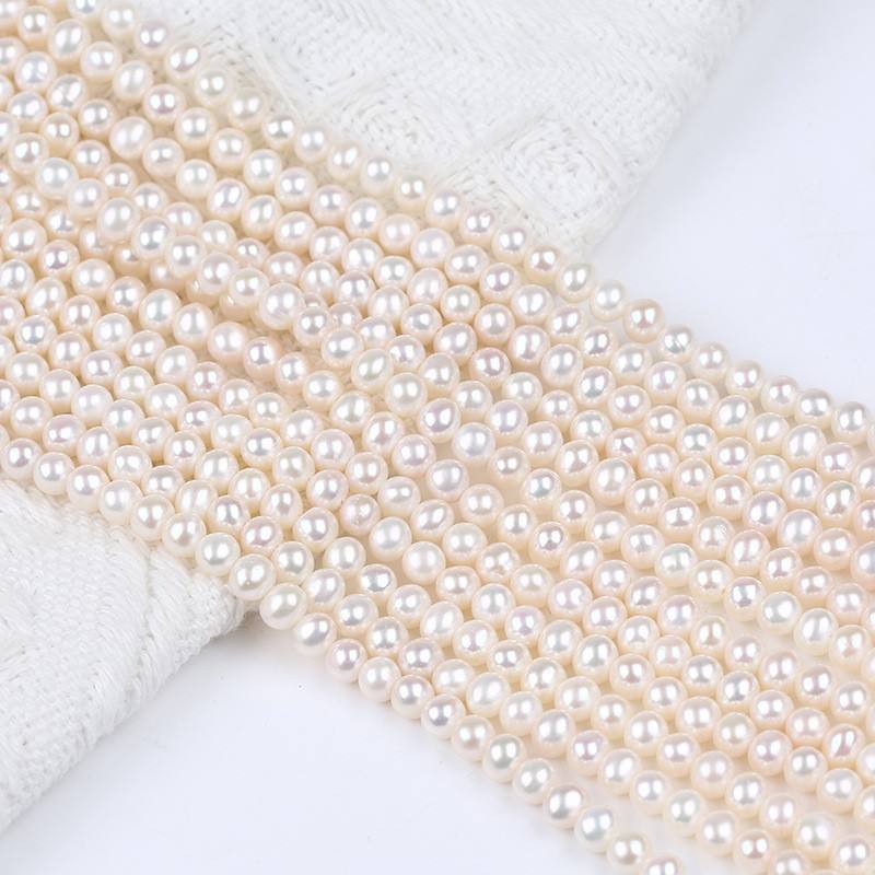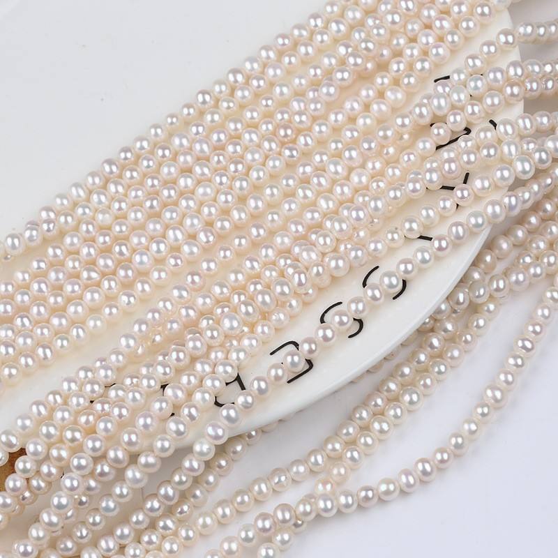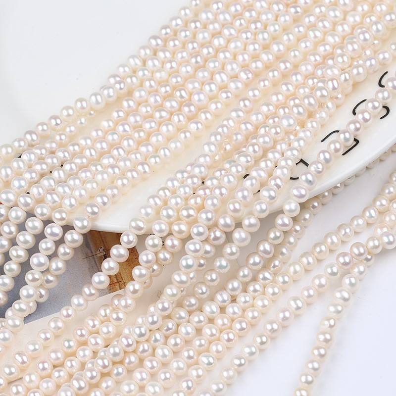 ไข่มุกน้ำจืดสีขาวธรรมชาติ ร้อยเป็นเส้น ขนาด 4-5 มม. สำหรับงาน DIY ทำต่างหู สร้อยคอ แบบกึ่งสำเร็จรูป จากจูจี