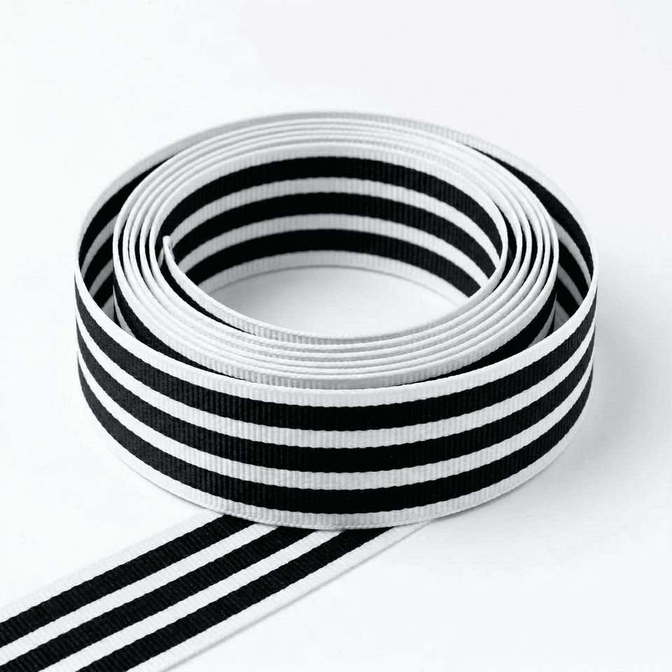 ริบบิ้นผ้าตกแต่งลายทางขาวดำขนาด 25 มม. จากนีลคามัล อินดัสทรีส์ สำหรับงานฝีมือ บรรจุภัณฑ์ และเครื่องแต่งกาย