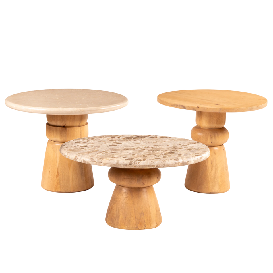 ชุดโต๊ะกาแฟตกแต่งบ้านแบบซ้อนสามชิ้น หน้าโต๊ะหินอ่อนลายต่างกัน พร้อมฐานและโครงสร้างไม้กระถินณรงค์แข็งแรง