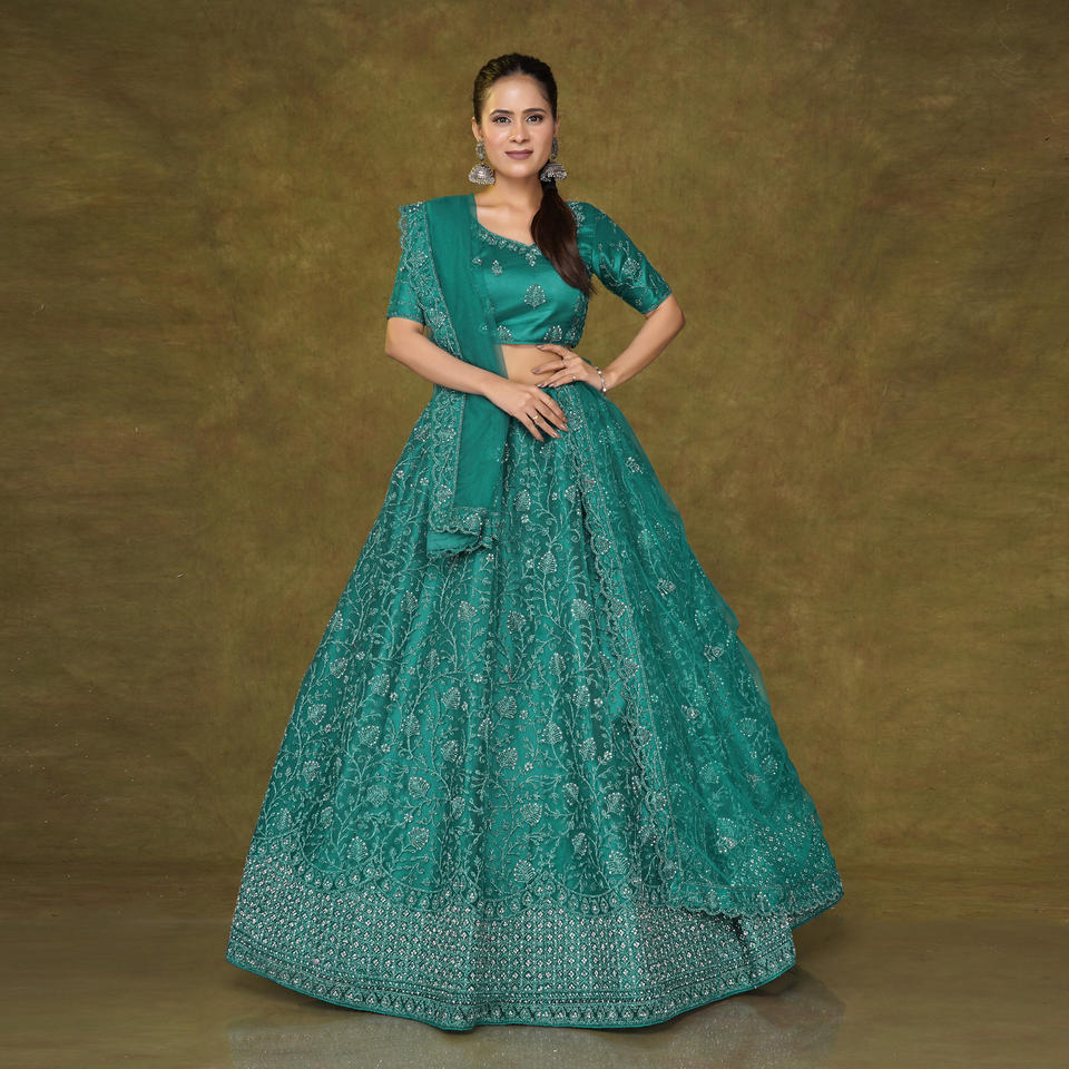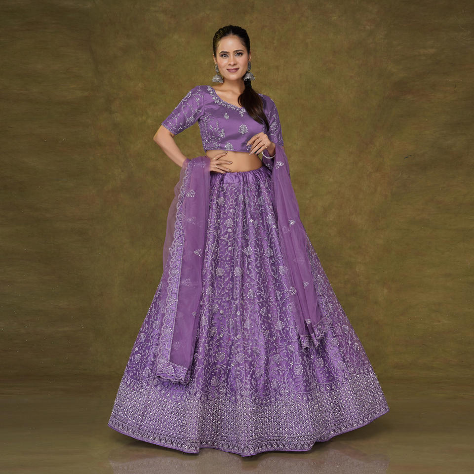 ชุดเลเฮนกาโชลีผ้าเน็ตประดับด้วยงานปักเรชามอย่างประณีต กระโปรงทรงบานหรูหรา เสื้อทรงพอดีตัว และผ้าคลุมไหล่พลิ้วไหว เหมาะสำหรับงานแต่งงาน