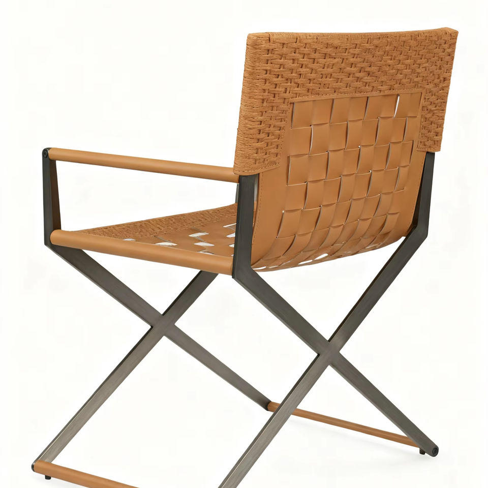 Handmade woven leather seat and back, powder-coated steel frame, elegant X-shape design, durable and lightweight