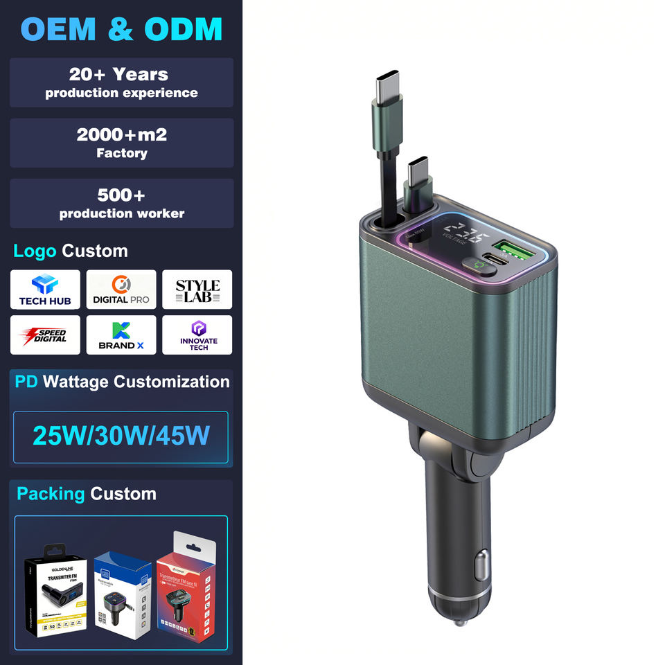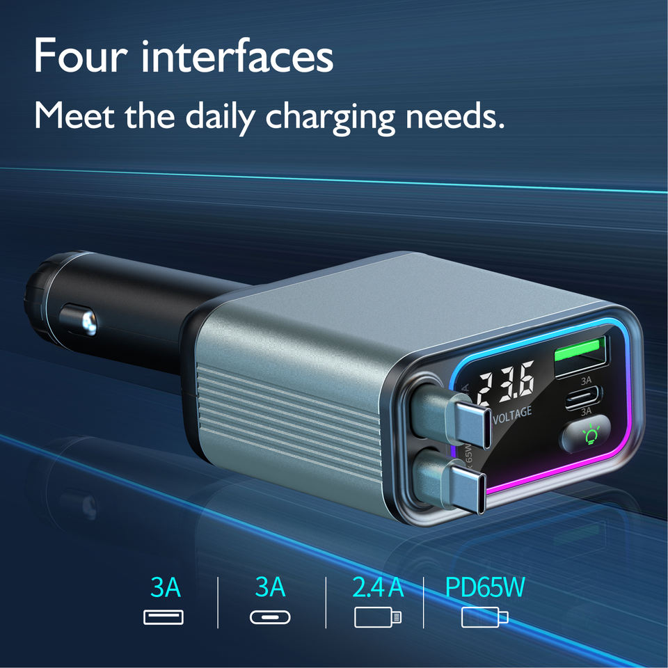 ที่ชาร์จในรถยนต์แบบเร็ว 4-in-1 กำลังไฟ 120W รุ่นใหม่ พร้อมสายชาร์จแบบยืดหดได้ รองรับ PD Charge และ QC3.0 สำหรับโทรศัพท์มือถือ แรงดันไฟฟ้า 12-24V ช่องชาร์จ 4-in-1