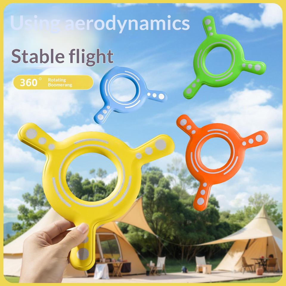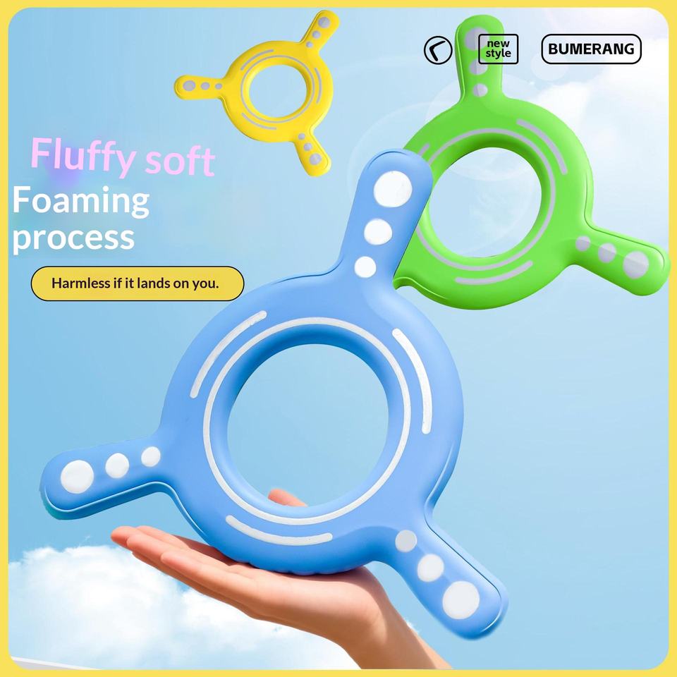 ของเล่นบูมเมอแรงใหม่สำหรับเด็กชายอายุ 2-4 ปี เหมาะสำหรับพ่อแม่ ใช้เล่นในสวนสาธารณะ กีฬากลางแจ้ง จานบินนุ่ม ยางสามใบพัด