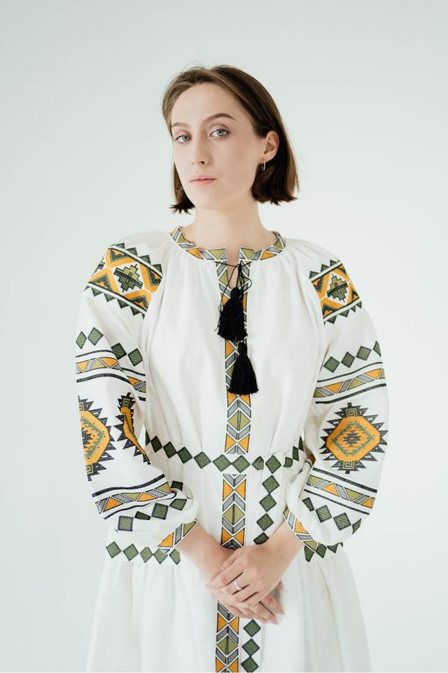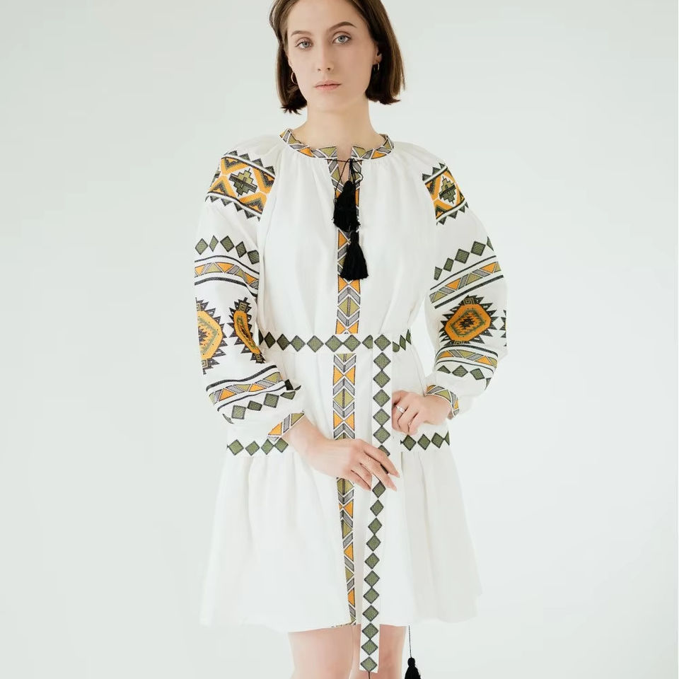 เดรสยาวปักลายสไตล์ชาติพันธุ์สำหรับผู้หญิงปี 2023 คอวี แขนสั้น เอวธรรมชาติ ผ้าทอ 100% ผ้าฝ้าย ซักได้ สวมใส่สบาย