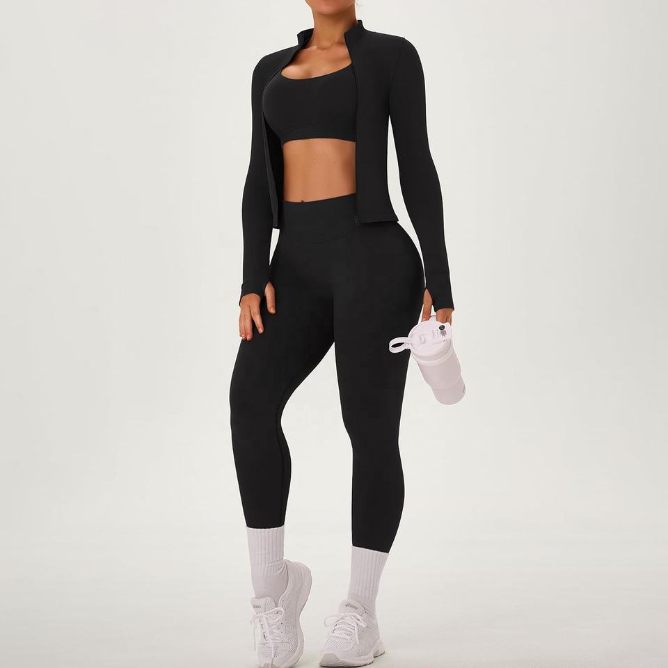 ชุดโยคะ 3 ชิ้น แบบไร้รอยต่อ เอวสูง รุ่นใหม่ ปี 2026 สำหรับผู้หญิง ชุดออกกำลังกาย เสื้อชั้นในกีฬา กางเกงเลกกิ้ง เสื้อครอปแจ็คเก็ต ชุดออกกำลังกาย