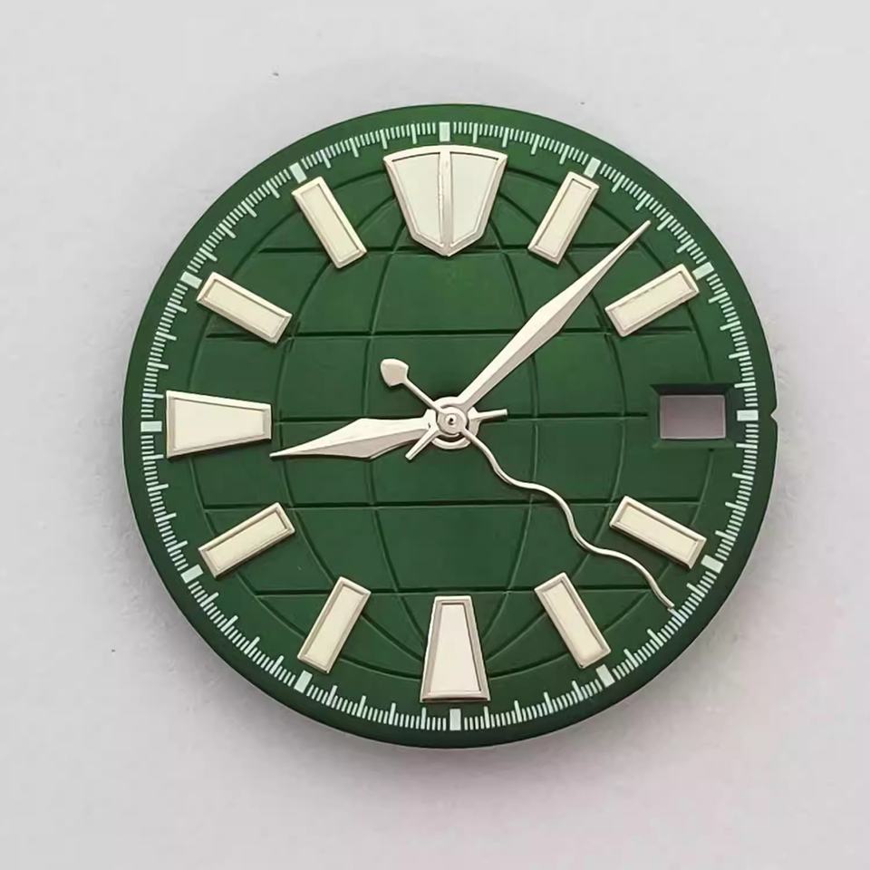หน้าปัดใหม่ขนาด 28.5 มม. สำหรับกลไก NH35/36/7S ทำจากสแตนเลส ลายซัน พร้อมเข็มเรืองแสงสีเขียวในที่มืด