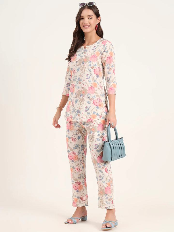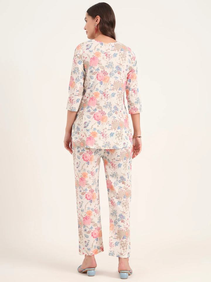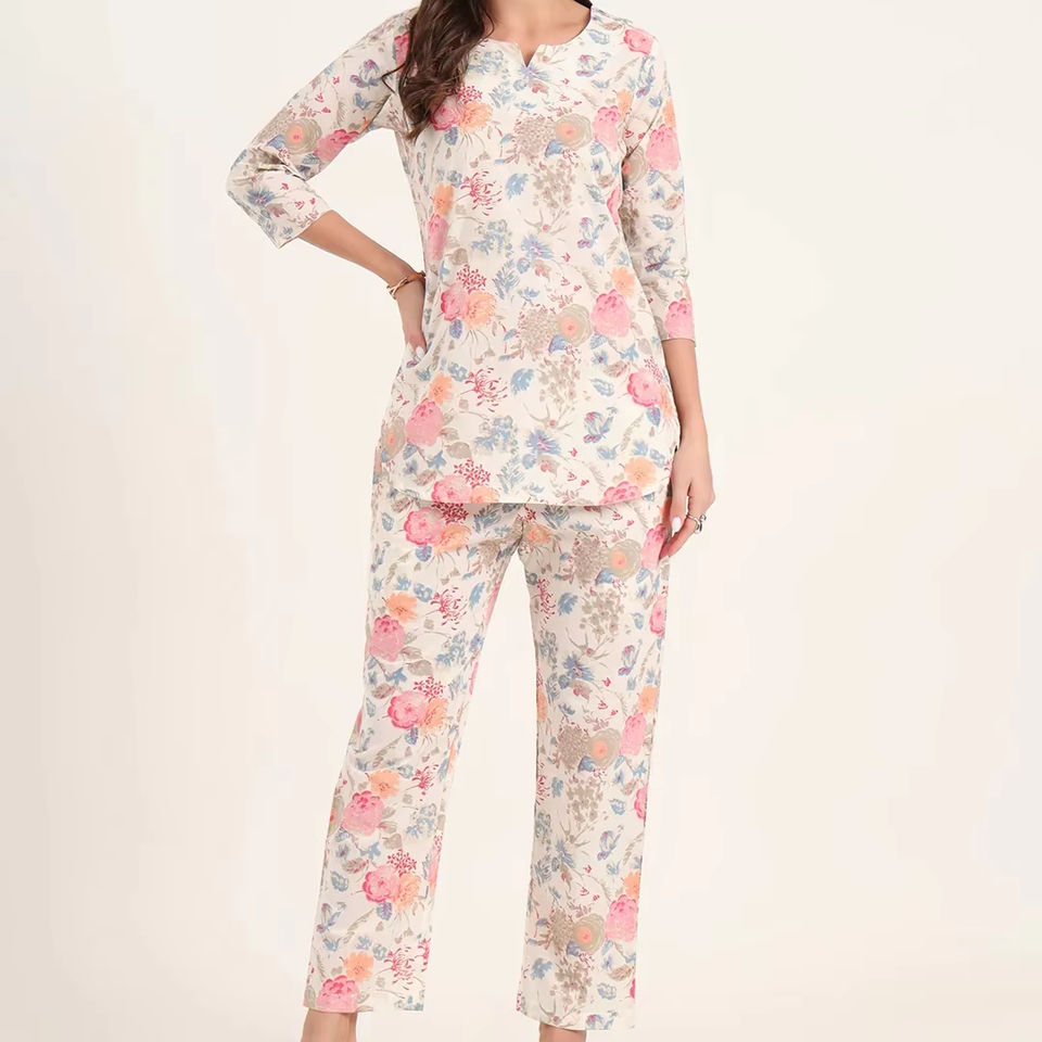 ชุดนอนผ้าฝ้ายลายดอกไม้ แขน 3/4 แบบใหม่ ลายพิมพ์บล็อกด้วยมือ ชุดนอนผู้หญิง สีพื้น ราคาขายส่ง