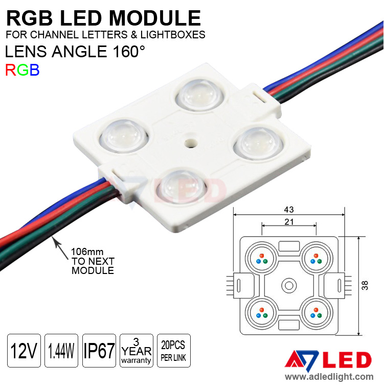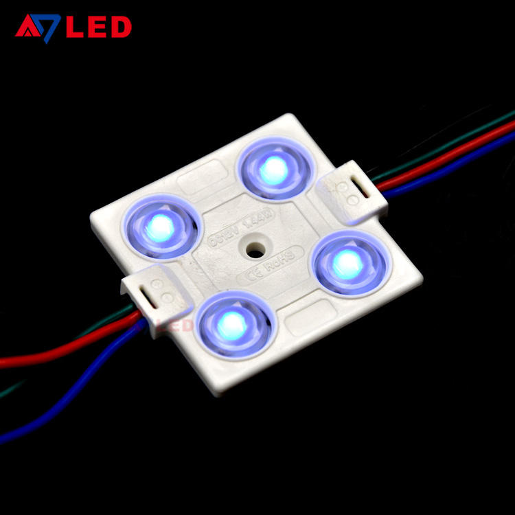 โมดูลไฟ LED แบบฉีดขึ้นรูป 4 หลอด LED RGB SMD5050 พร้อมเลนส์ IP67 DC12V สำหรับกล่องไฟและป้ายไฟ โมดูล LED RGB 12V
