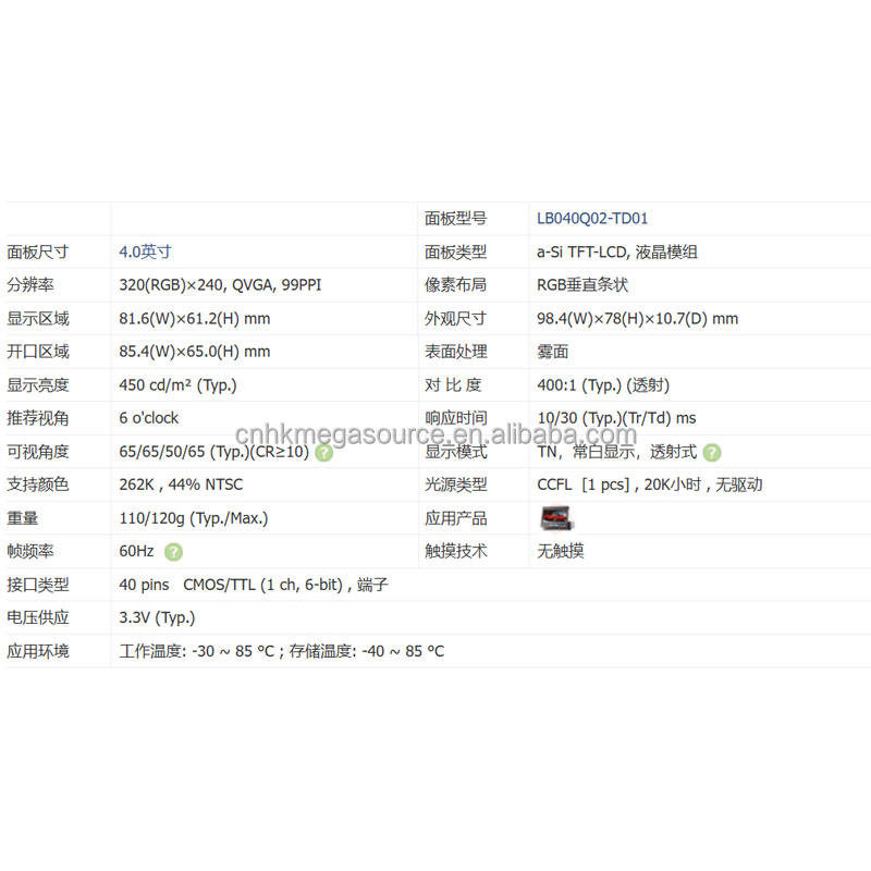 หน้าจอแอลซีดีโมดูลแสดงผลขนาด4นิ้ว320*240แผงจอ LCD TFT LB040Q02-TD01