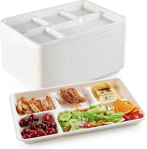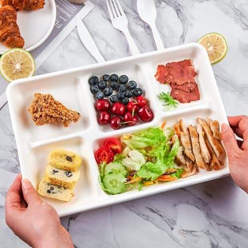 จานอาหารแบ่งช่อง 5 ช่อง ทำจากชานอ้อย ย่อยสลายได้ จานเสิร์ฟอาหาร จาน จานอาหาร ดีไซน์แบบเอเชียนเซน สำหรับกลับไปโรงเรียน ปราศจากพลาสติก ปี 2026