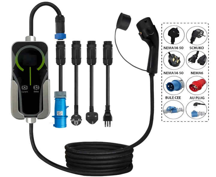 เครื่องชาร์จรถยนต์ไฟฟ้าแบบปรับได้ 7KW 32A รุ่นใหม่ พร้อมปลั๊ก Type 2 สายเคเบิลแบบพกพา 5 เมตร ป้องกันน้ำและฝุ่นระดับ IP66 ควบคุมผ่านแอปพลิเคชัน รองรับแรงดันไฟฟ้า 200-220V รับประกัน 3 ปี