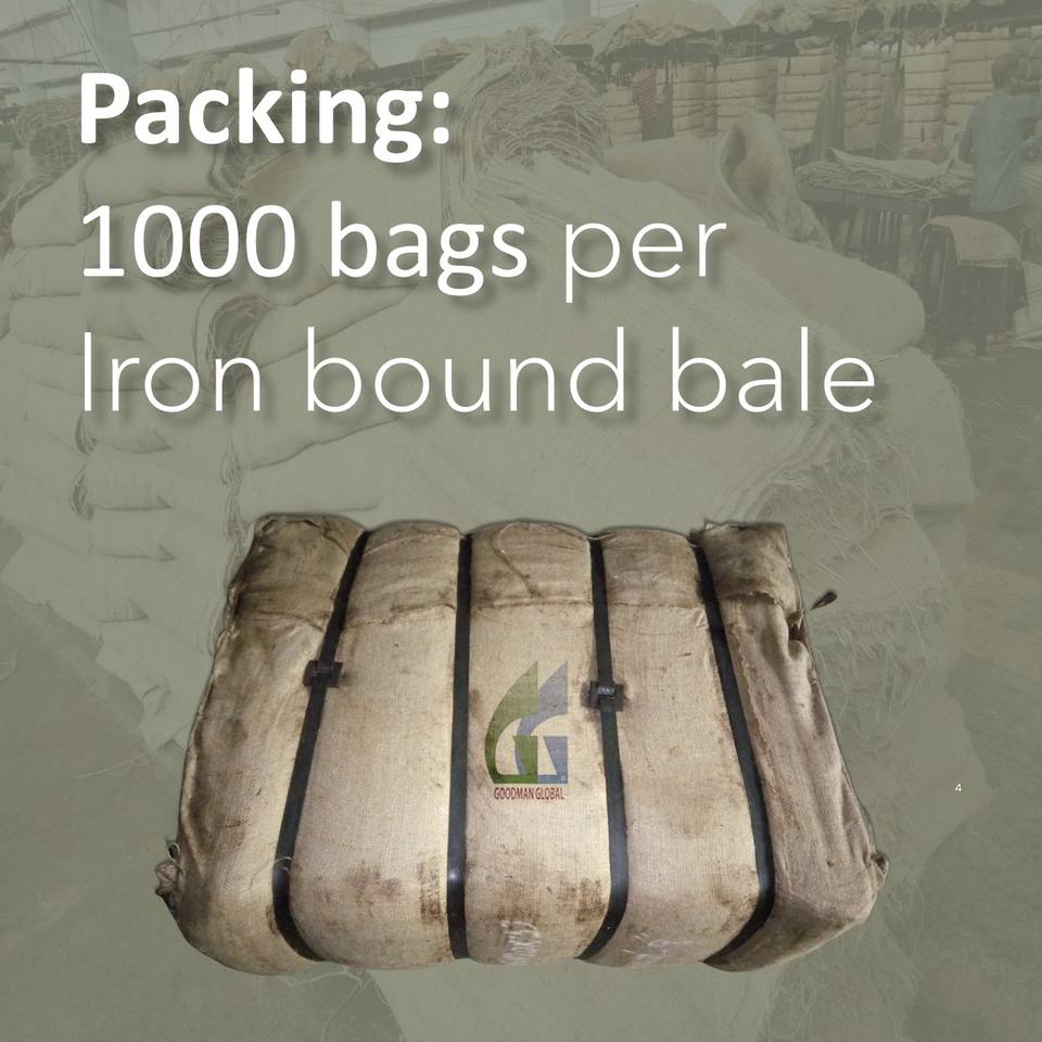 1000 ถุงต่อมัด; 90 มัดต่อตู้ 20 ฟุต หรือ 128 มัดต่อตู้ 40 ฟุต HC