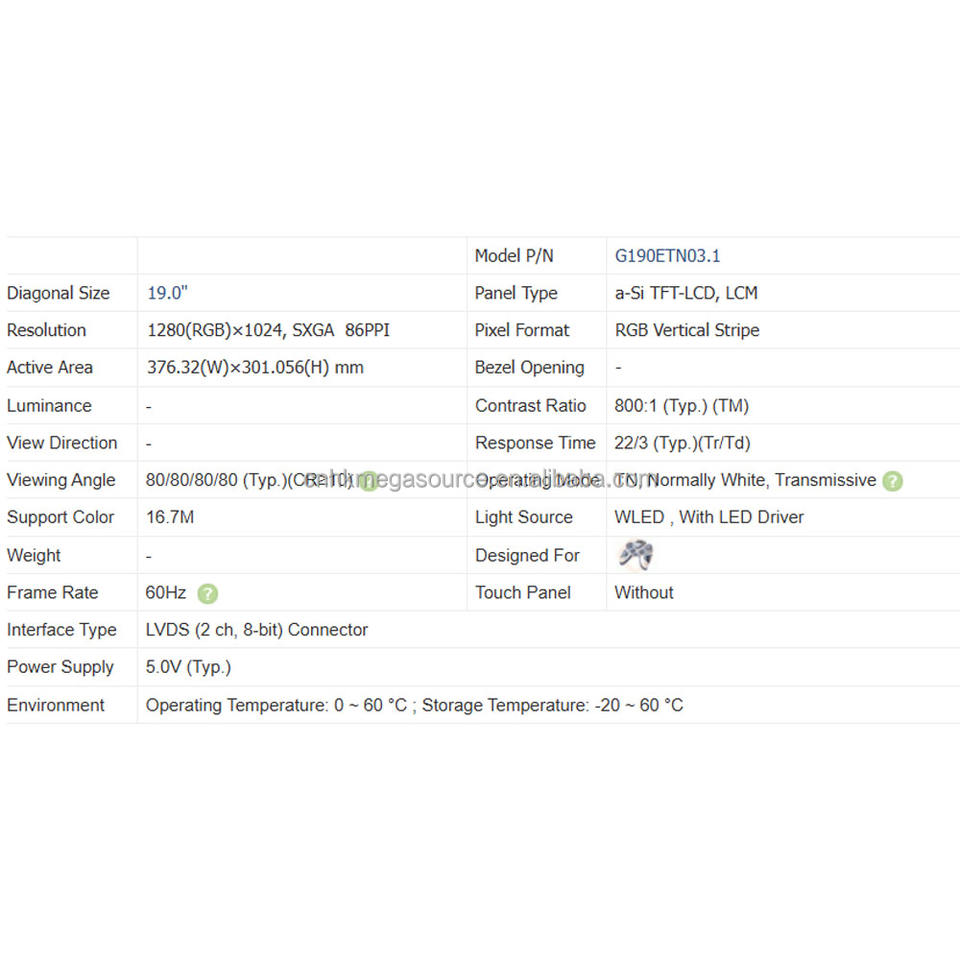 ใหม่ AUO 19นิ้ว1280*1024โมดูลแสดงผล LCD หน้าจอ G190ETN03.1จอแสดงผล TFT-LCD LVDS