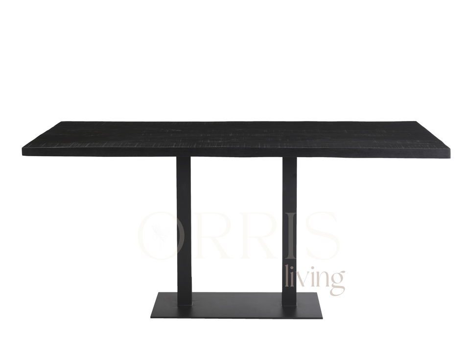โต๊ะอาหารสไตล์นิวเอจ ท็อปไม้เนื้อแข็ง ขาเหล็กแข็งแรง ฐานสีดำเรียบหรู ดีไซน์งานฝีมือ ทนทาน เหมาะสำหรับพื้นที่ร่วมสมัย