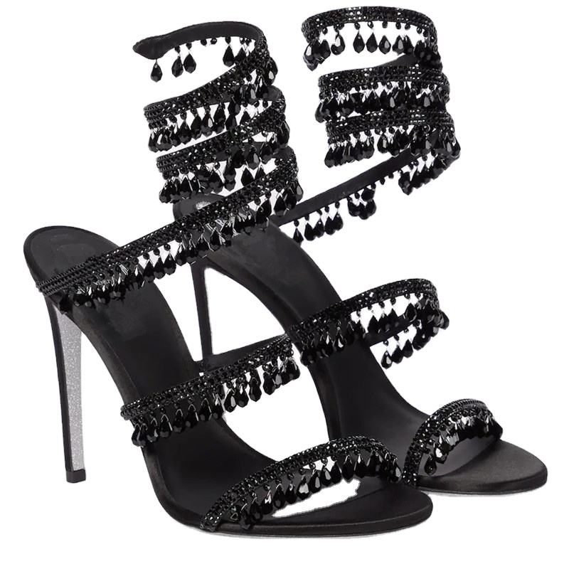 รองเท้าส้นสูงผ้าซาตินประดับคริสตัลรูปงูแบบใหม่สไตล์อเมริกันสำหรับผู้หญิง ตกแต่งพู่ห้อยประดับเพชรแบบพันรอบ สวมใส่ง่าย เซ็กซี่