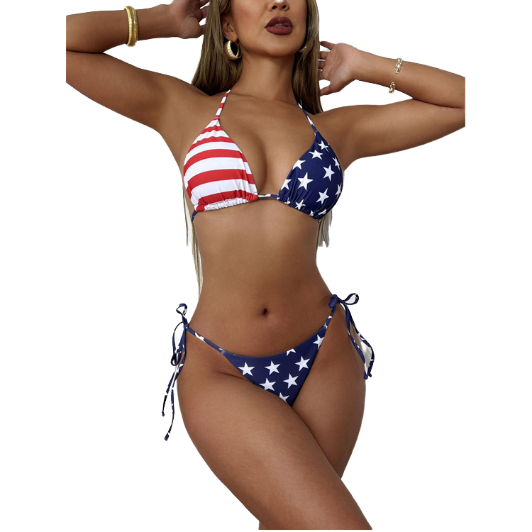 ชุดว่ายน้ำบิกินี่ลายธงชาติอเมริกันแบบใหม่ พิมพ์ลายดาวห้าแฉก เอวสูง โชว์ช่วงเอว สายรัดแบบสามเหลี่ยม เซ็กซี่
