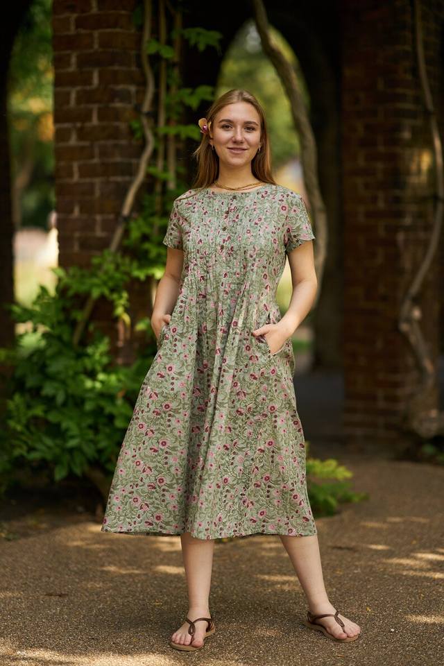 ชุดเดรสโบฮีเมียนใหม่ชุดเดรสผ้าฝ้ายแท้พิมพ์ลายดอกไม้สีเขียวและสีชมพูสำหรับฤดูร้อน