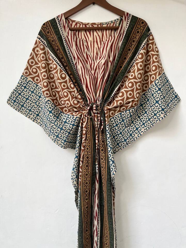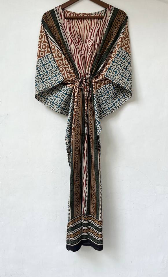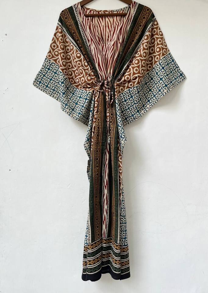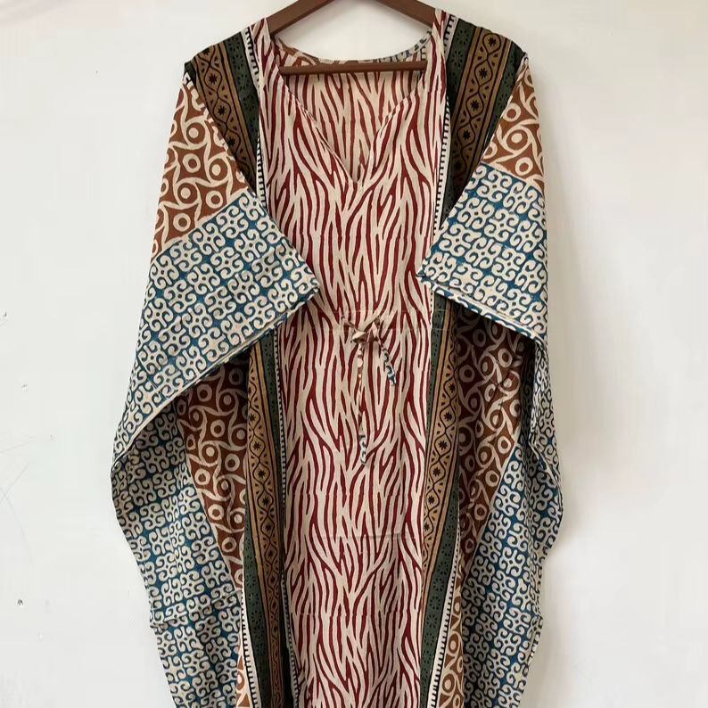 ชุดคลุมชายหาดลายสัตว์แบบใหม่ คอวี ปิดด้วยเชือกผูก ทรงปล่อยชายระบาย ผ้าฝ้ายอินเดียเนื้อนุ่ม แต่งลูกไม้ ยาวเต็มตัว สำหรับผู้หญิง