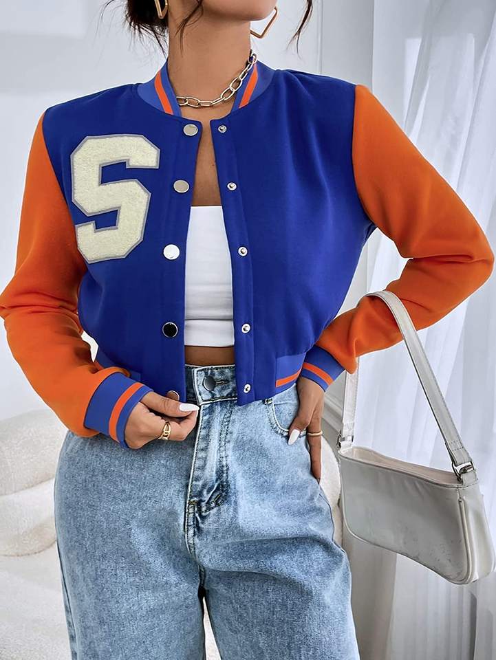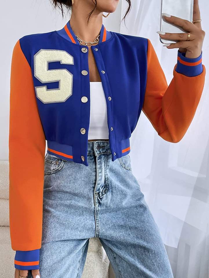 เสื้อแจ็กเก็ตครอปท็อปสไตล์วาร์ซิตี้สำหรับผู้หญิง